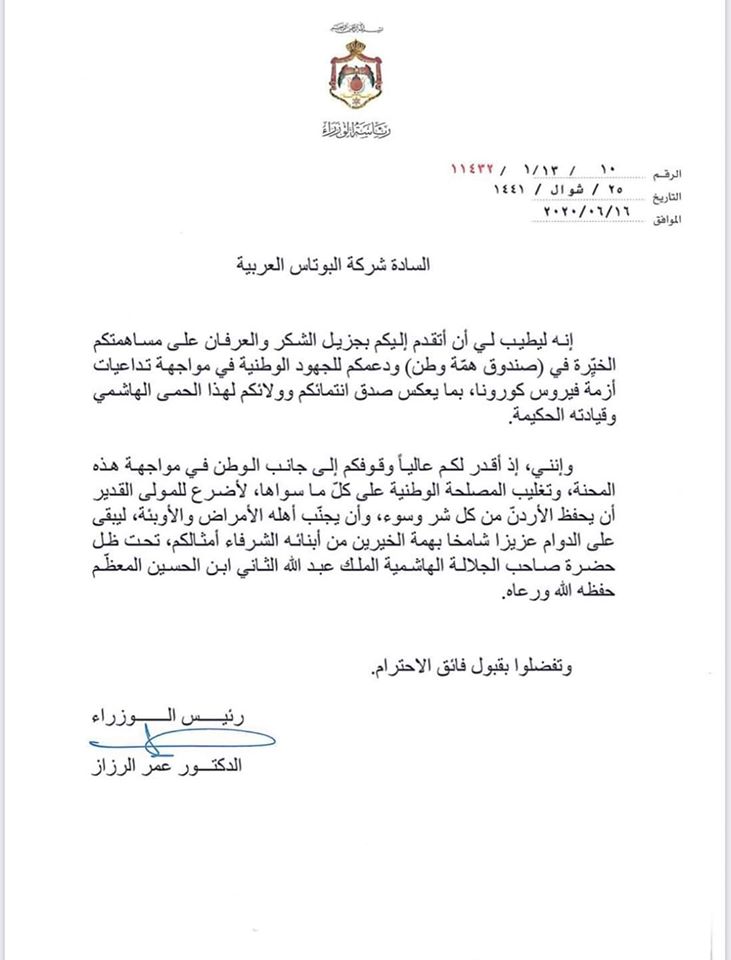 وفي كتاب رسمي تم توجيهه للشركة ، أعرب الدكتور الرزاز، عن تقديره لوقوف " البوتاس" إلى جانب الوطن في مواجهة هذه المحنة وتغليب المصلحة الوطنية على كل ما سواها، داعيا الله أن يحفظ الأردن من كل شر وسوء وان يجنب أهله الأمراض والأوبئة ليبقى على الدوام عزيزا شامخا بهمة الخيرين من أبنائه الشرفاء تحت ظل حضرة صاحب الجلالة الملك عبدالله الثاني ابن الحسين