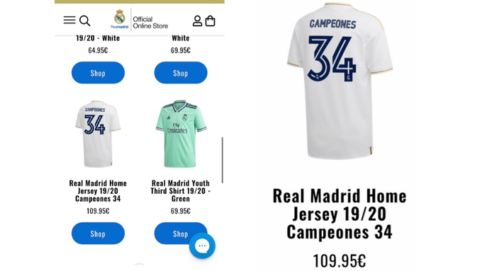 ويحمل القميص رقم34 في الخلف مع كلمة "الأبطال"، في إشارة لمجموع ألقاب الريال في الدوري،ومحدد ثمنه بـ109.95 يورو.