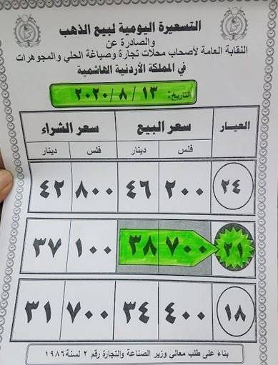 وسجل سعر بيع غرام الذهب عيار 21 الأكثر تداولا بين الأردنيين 38.70 دينارا فيما كان سعر البيع الأربعاء 38 دينارا.