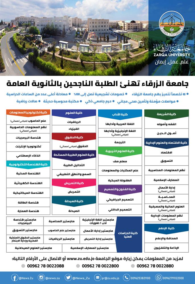 ومما يذكر أنّ جامعة الزرقاء تأسست عام 1994 شرقي مدينة الزرقاء، بوصفها أول جامعة خاصة في محافظة الزرقاء، بمساحة 350 دونماً، لتكون رديفاً عضوياً للجامعات الأردنية الأخرى في المنهج والهدف، ورافداً رئيساً لنظام التعليم العالي الأردني بمختلف غاياته وأهدافه، وقد جاءت انطلاقتها تلبية لحاجات علمية واجتماعية واقتصادية وثقافية وإنسانية.