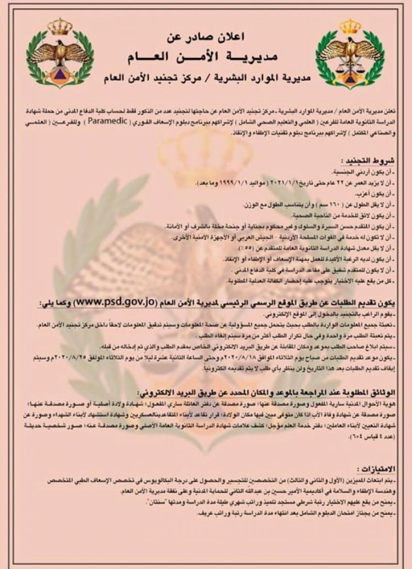 اخبار البلد-أعلنت مديرية الأمن العام مديرية الموارد البشرية / مركز تجنيد الأمن العام عن رغبتها بتجنيد عدد من الذكور لحساب كلية الدفاع المدني.