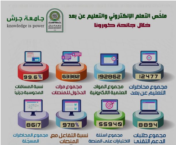 تحت اشراف مباشر من رئيس جامعة جرش يوسف ابو العدوس، انهت عمادة التعليم الالكتروني والتعليم عن بعد تجهيزاتها للعام الدراسي المقبل، حسب متطلبات المرحلة التعليمية التي فرضتها جائحة "كورونا".