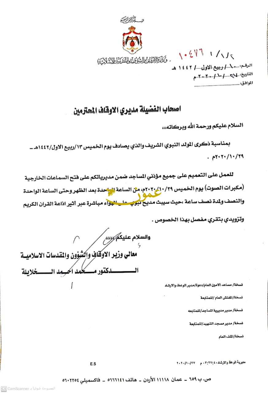 اخبار البلد ـ عمم وزير الاوقاف والشؤون والمقدسات الاسلامية الدكتور محمد الخلايلة على كافة مديري الاوقاف في المملكة للتأكيد على جميع مؤذني المساجد لفتح السماعات الخارجية "مكبرات الصوت" يوم الخميس حيث سيبث مديح نبوي على الهواء مباشرة.