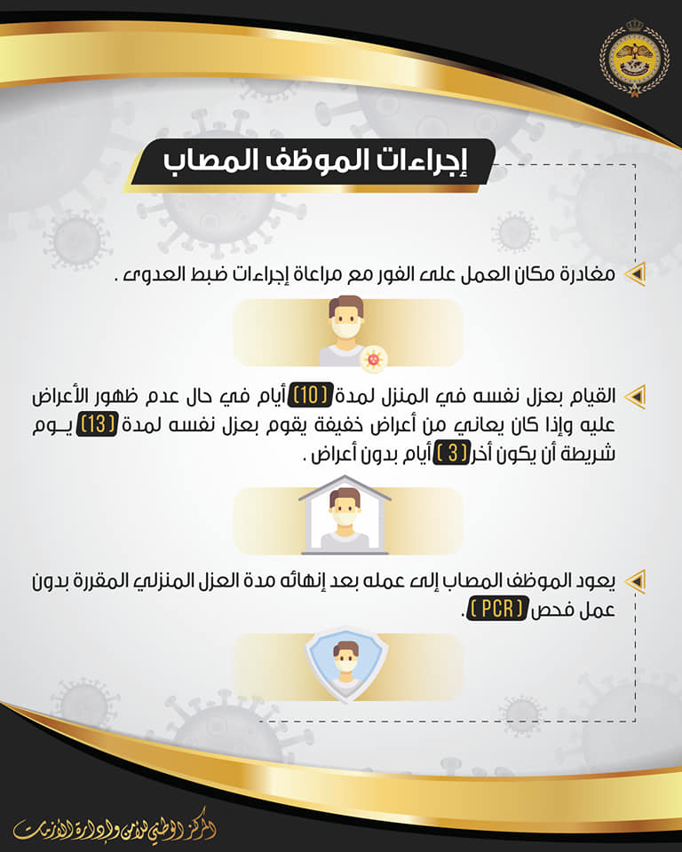 ويتوجب على الموظف المصاب بكورونا مغادرة مكان العمل على الفور، مع مراعاة اجراءات ضبط العدوى.