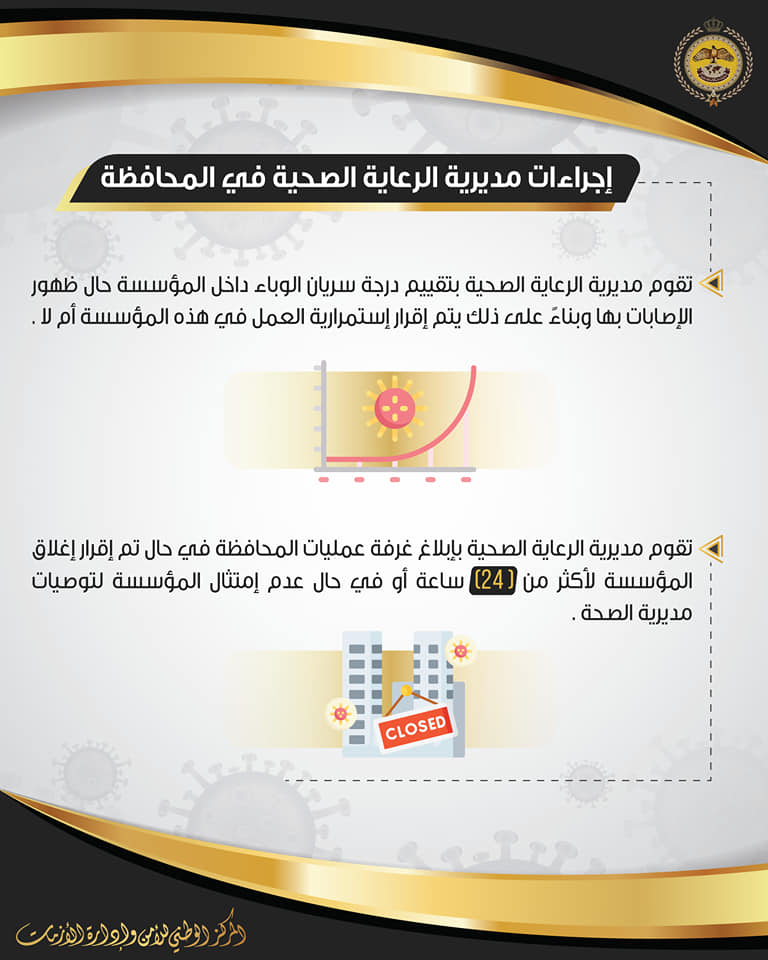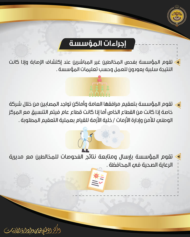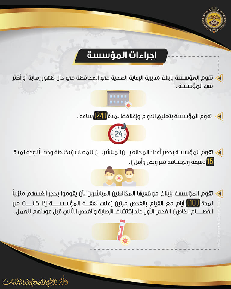 ووفقاً للاجراءات التي أعلنها مركز إدارة الازمات، يتوجب إغلاق المؤسسة وتعليق الدوام فيها مدة 24 ساعة، إضافة الى حصر المخالطين المباشرين وابلاغهم بحجر انفسهم 10 ايام وفحصهم مرتين على نفقة المؤسسة اذا كانت من القطاع الخاص.