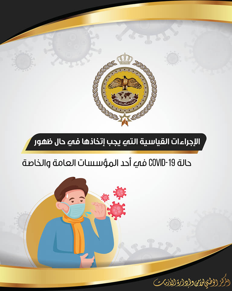 اخبار البلد ـ أعلن المركز الوطني للأمن وادارة الازمات، صباح الأحد، الدليل الشامل للإجراءات الواجب اتخاذها في حال ظهور حالة كورونا في المؤسسات العامة والخاصة.