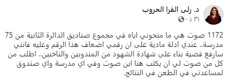 وقالت الدكتور الحروب في منشورها ان (1172) صوت هي ما منحوني اياه في مجموع صناديق الدائرة الثانية من (75) مدرسة .
