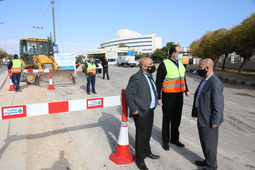 قام وزير المياه والري الدكتور معتصم سعيدان يرافقه امين عام سلطة المياه بالوكالة المهندس احمد عليمات ومدير ادارة الأزمات والسيطرة السيد ابراهيم عبادة، خلال زيارة ميدانية مبكرة صباح يوم السبت الموافق 28/11/2020 بتفقد اعمال تنفيذ ايصال خدمات المياه والصرف الصحي التي تنفذ لخدمة المستشفى الميداني في حرم مستشفى الامير حمزة ، حيث التقى بالموقع كل من الدكتور وائل الهياجنة مسؤول ملف كورونا في وزارة الصحة والرئيس التنفيذي لشركة مياهنا المهندس محمد العوران .