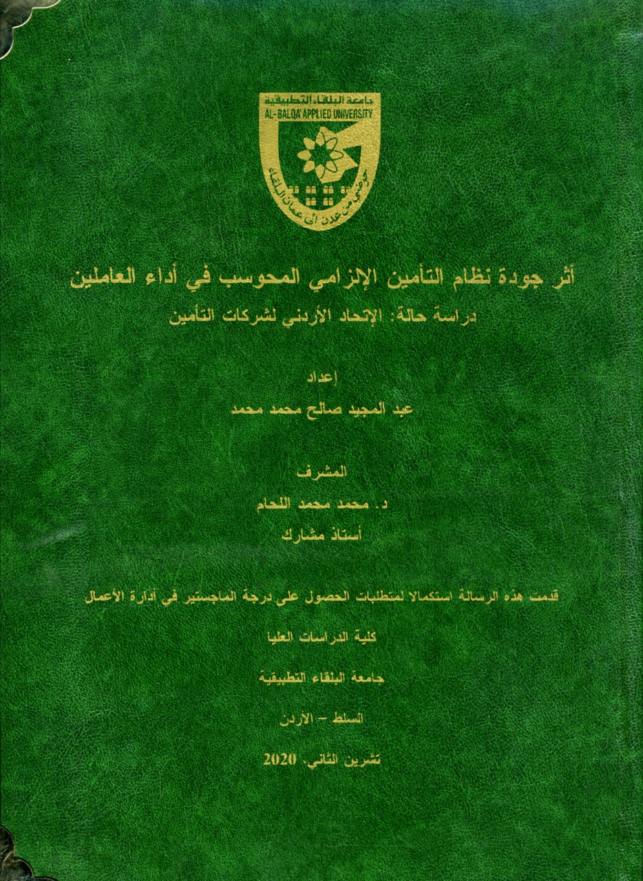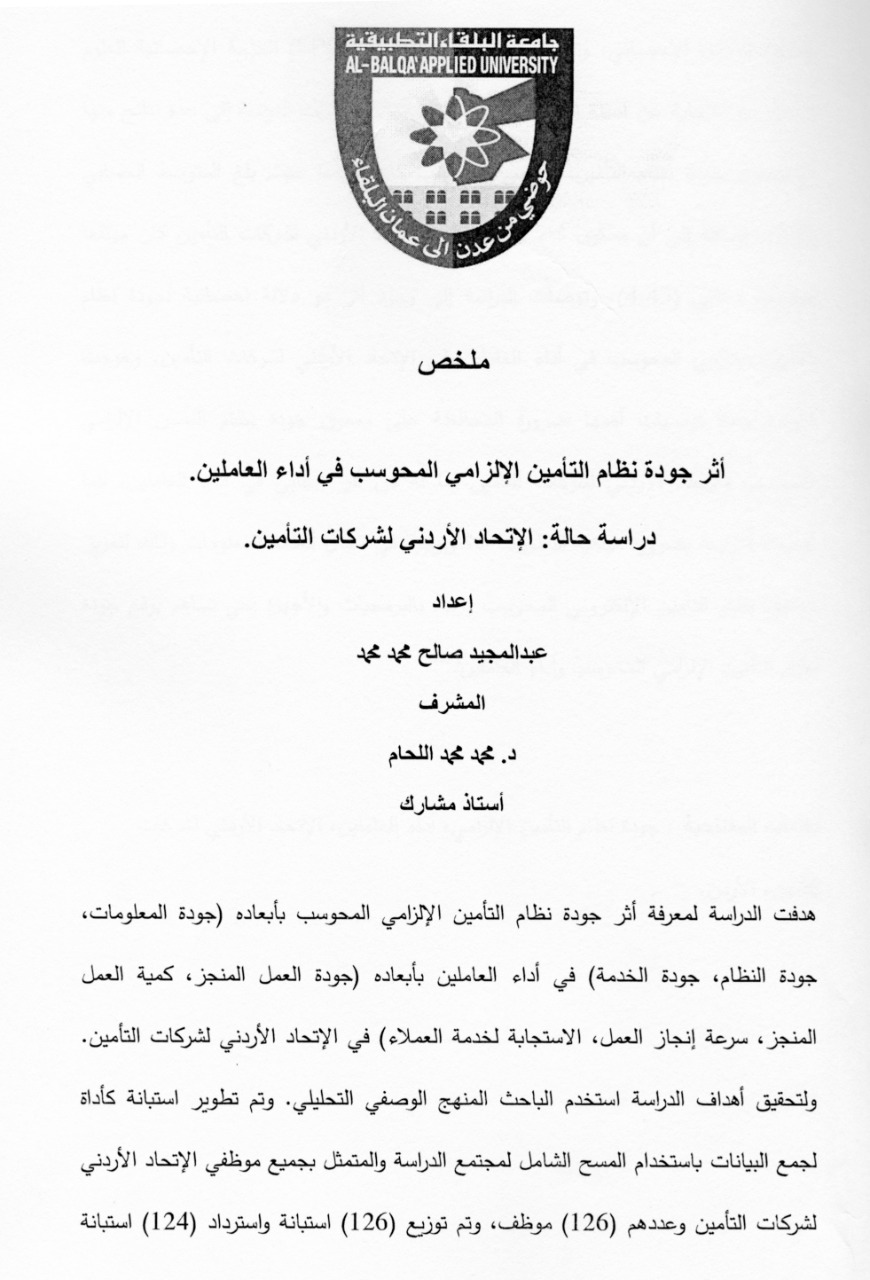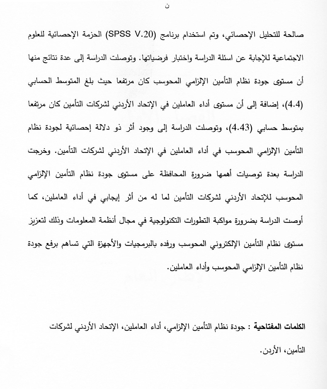 وسلطت الدراسة الضوء على أثر جودة نظام التأمين الالزامي المحوسب والمعمول به لدى الاتحاد الاردني لشركات التأمين وأثره على أداء العاملين فيه، وتوصلت الدراسة الى وجود أثر ايجابي وواضح بجودة نظام التأمين الالزامي في أداء العاملين في الاتحاد، وأوصت الدراسة بضرورة المحافظة على مستوى جودة نظام التأمين الالزامي والعمل على تعزيزه لما له من دور كبير في رفع مستوى أداء العاملين.