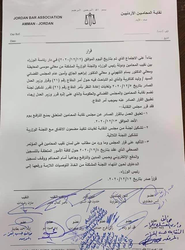 وقال كتاب للنقابة إنه تقرر تشكيل لجنة تضم نقابة المحامين والمجلس القضائي والحكومة لغايات إعادة النظر بأمر الدفاع 21، والذي على إثره "قرر وزير العدل إرجاء تطبيق القرار الصادر عنه بموجب أمر الدفاع".
