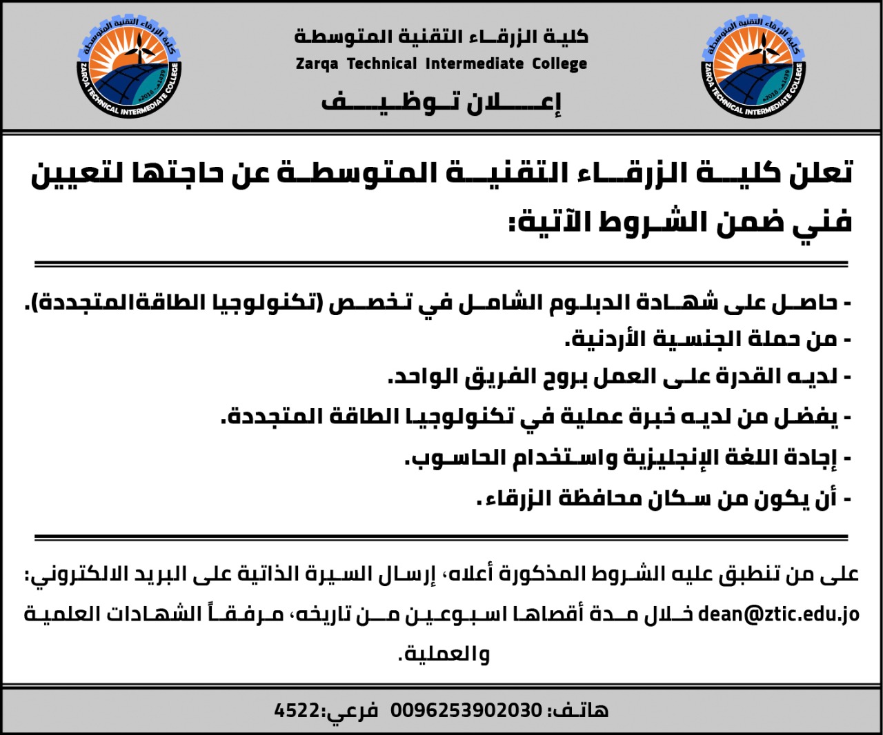 كلية الزرقاء التقنية المتوسطة تعلن عن حاجتها لتعيين فني