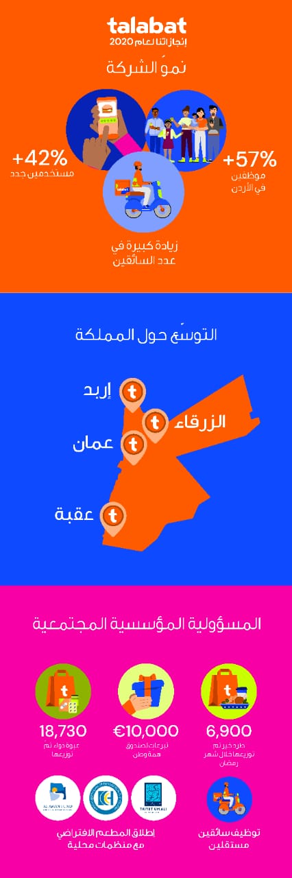 هذا وتمتلك "طلبات الأردن" خططاً طموحة للعام 2021 بما يشمل إضافة مطاعم ومتاجر جديدة لشبكتها في عدد أكبر من المدن، مع خيارات وعروض أكثر غنى، بالإضافة لنشاطات أوسع ومزيد من التمكين للطاقات البشرية الوطنية عبر فرص العمل المباشرة وغير المباشرة، ومن خلال برامج العمل التنموي المسؤول.