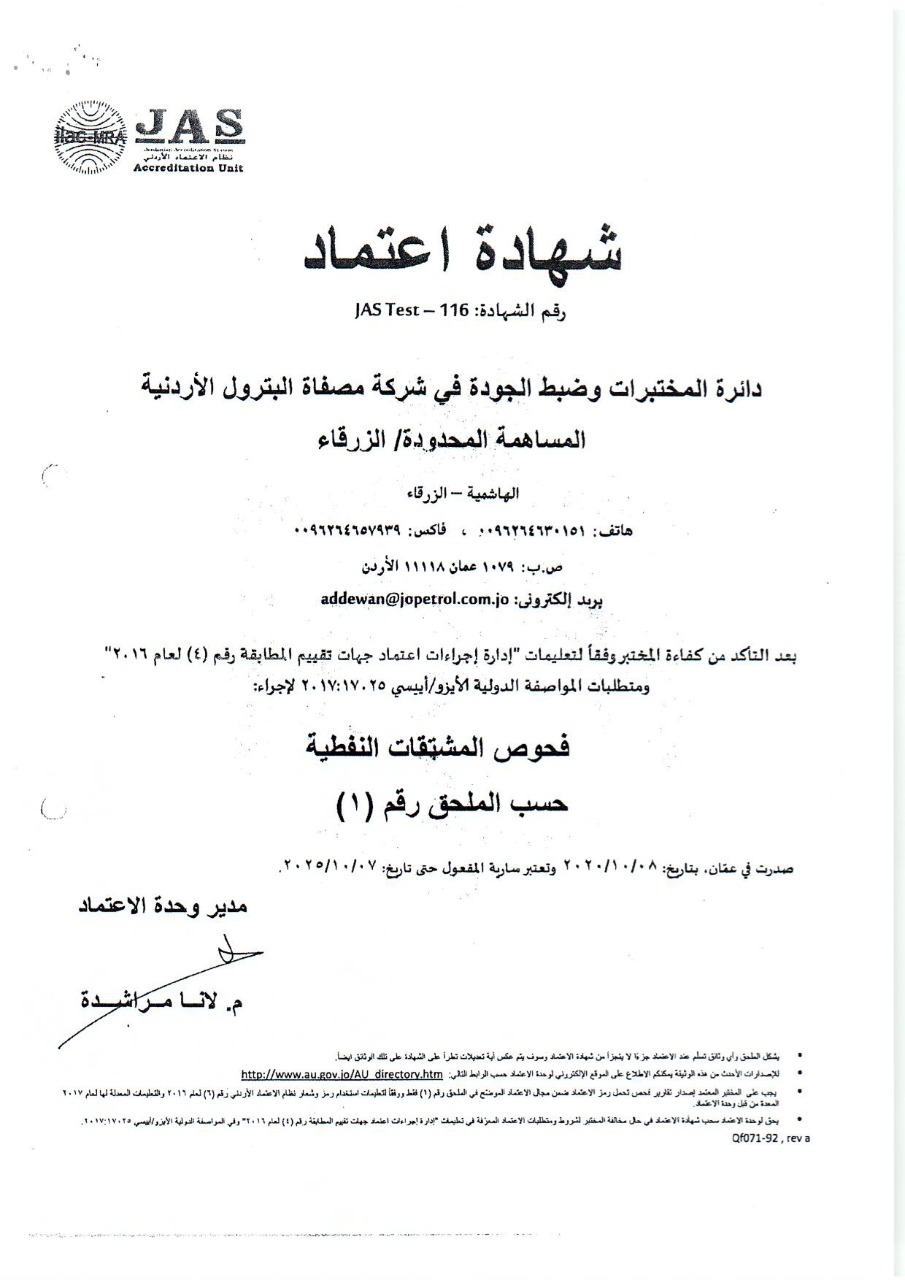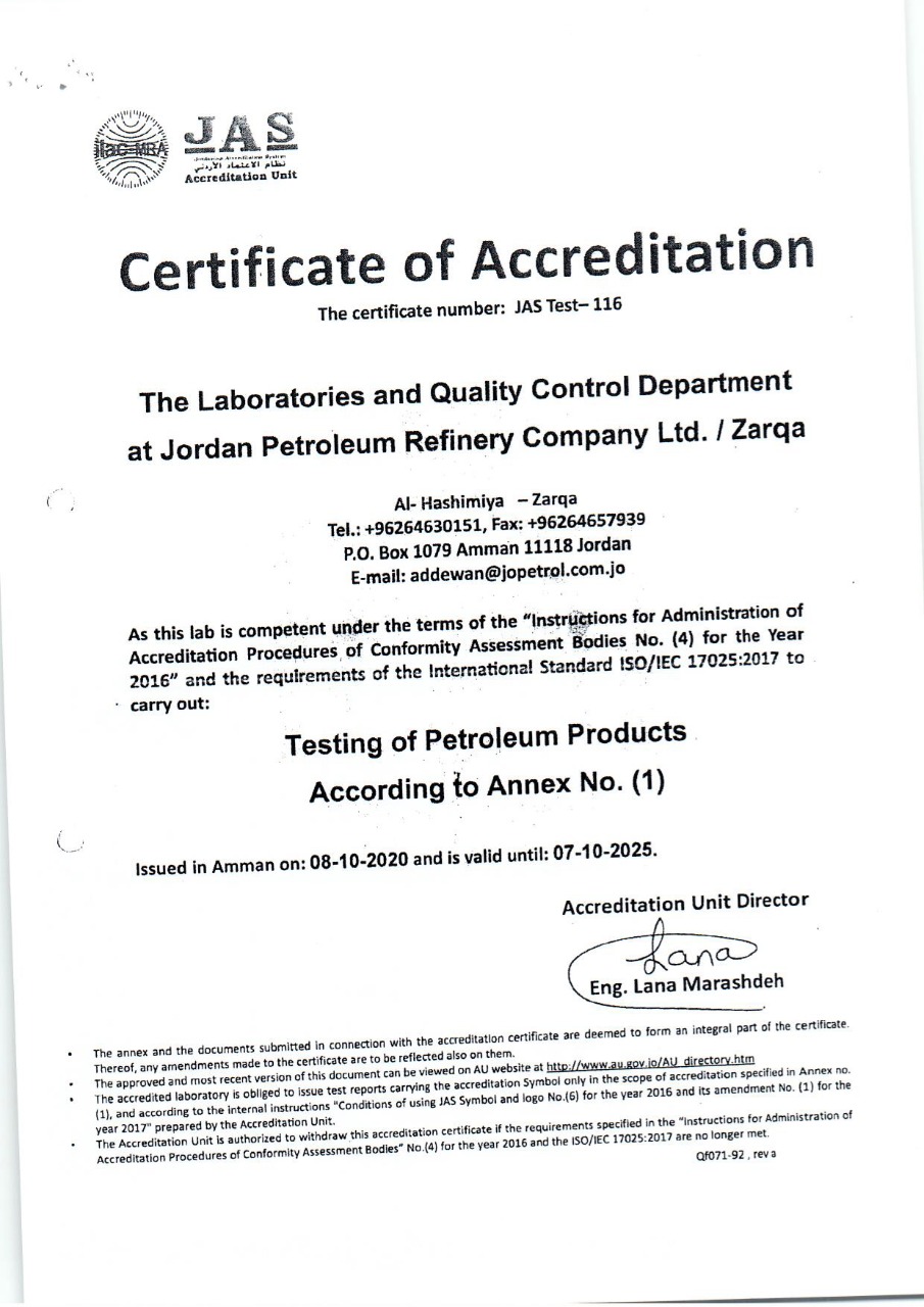 اخبار البلد-حصلت دائرة المختبرات وضبط الجودة في شركة مصفاة البترول الأردنية على شهادة الاعتماد الدولي من قبل وحدة الاعتماد الأردني -المعترف بها من قبل هيئة التعاون الدولي لاعتماد المختبرات- في مجال فحوص المشتقات النفطية وفــق متطلبــات نظام الايــزو ISO/IEC 17025:2017)) وذلك اعتبارا من 8 تشرين الثاني 2020 ولغاية 7 تشرين الثاني 2025.