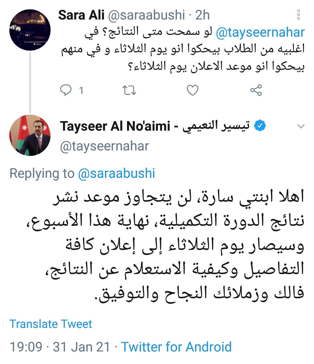 اخبار البلد- اجاب وزير التربية والتعليم تيسير النعيمي طالبة كانت قد استفسرت عن نتائج الدورة التكميلية على موقع التواصل الاجتماعي تويتر .