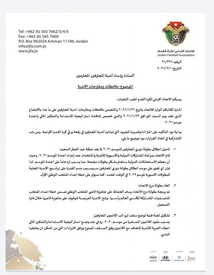وكانت الأندية اقترحت تأجيل انطلاق بطولة الدوري لما بعد عطلة عيد الفطر، واعتبر الاتحاد أن أي تغيير على موعد انطلاقها سيسبب عدم القدرة على ترشيح الأندية المحلية للبطولات الآسيوية لموسم 2022 في الوقت المحدد، وسيؤثر على خطة إعداد المنتخب الوطني الأول.