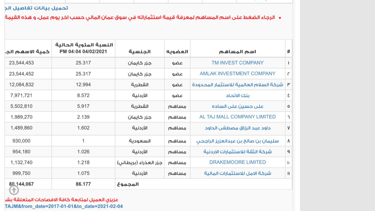الأخبار المتواردة والمتوفرة على مركز الإيداع تشير بأن القطري السادة يملك ما مجموعه ٥.٥ مليون سهم، حيث دخل كمضارب على السهم ولكنه تورط بالأسهم المليونية الخمسة ولا نعلم أن كان من يستطيع أن يفك لغز وطلاسم العلاقة بين دخول شركة الأمل على سهم التاج مول مع السادة الذي يملك كما قلنا أكثر من خمسة مليون سهم خصوصا وأن القطري السادة يعتبر المالك الأكبر والمهيمن بلا منازع على شركة الأمل منذ سنتين تقريبا.