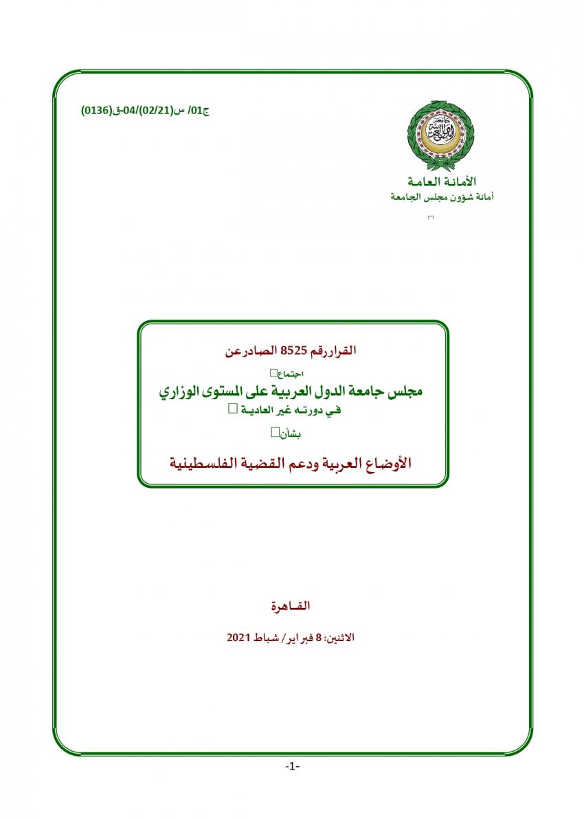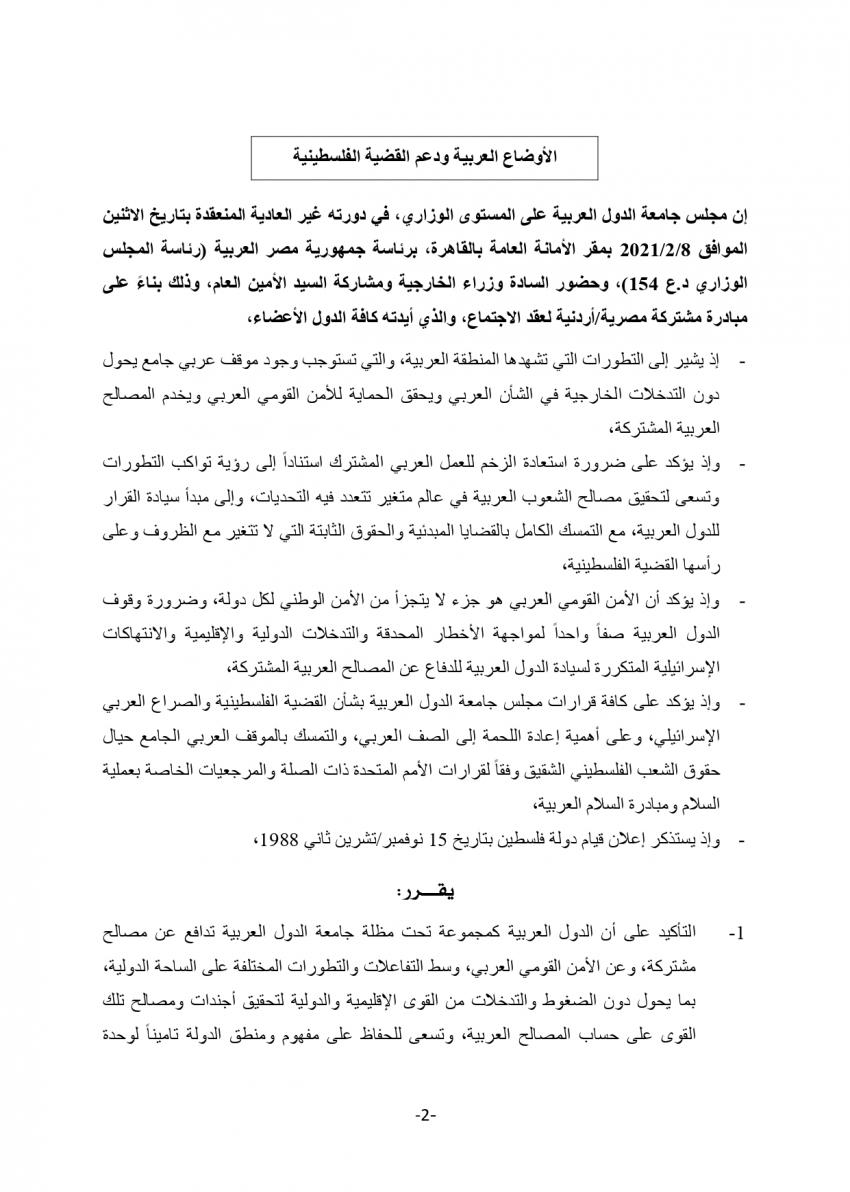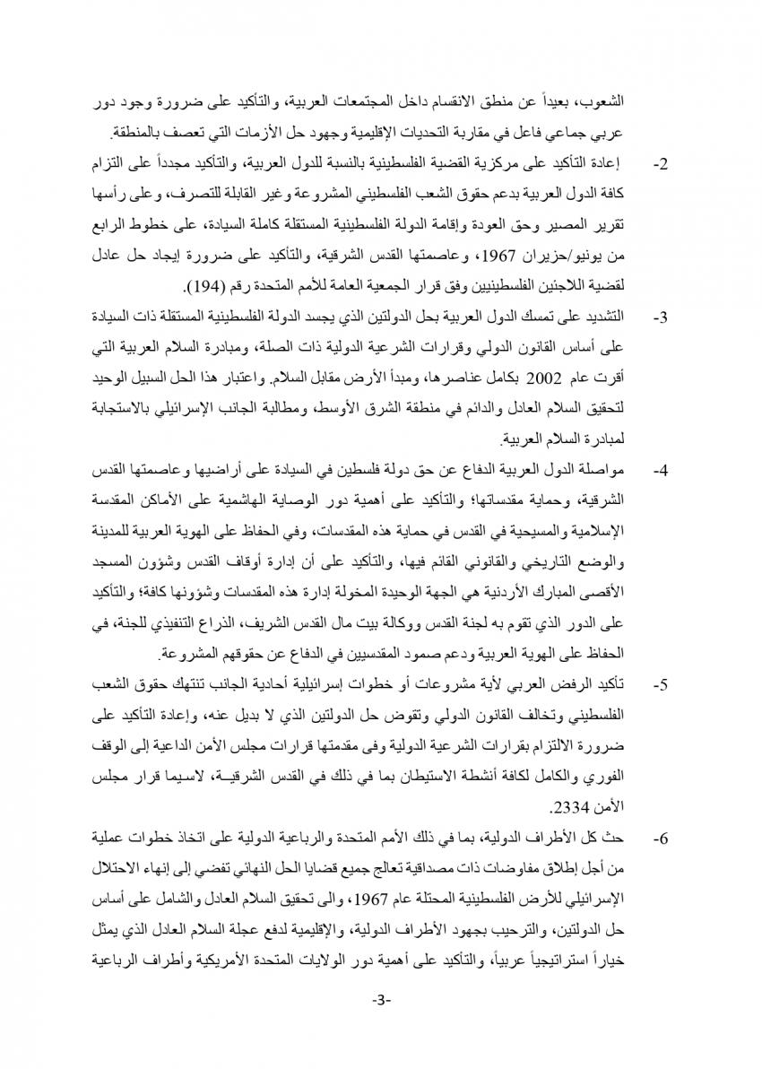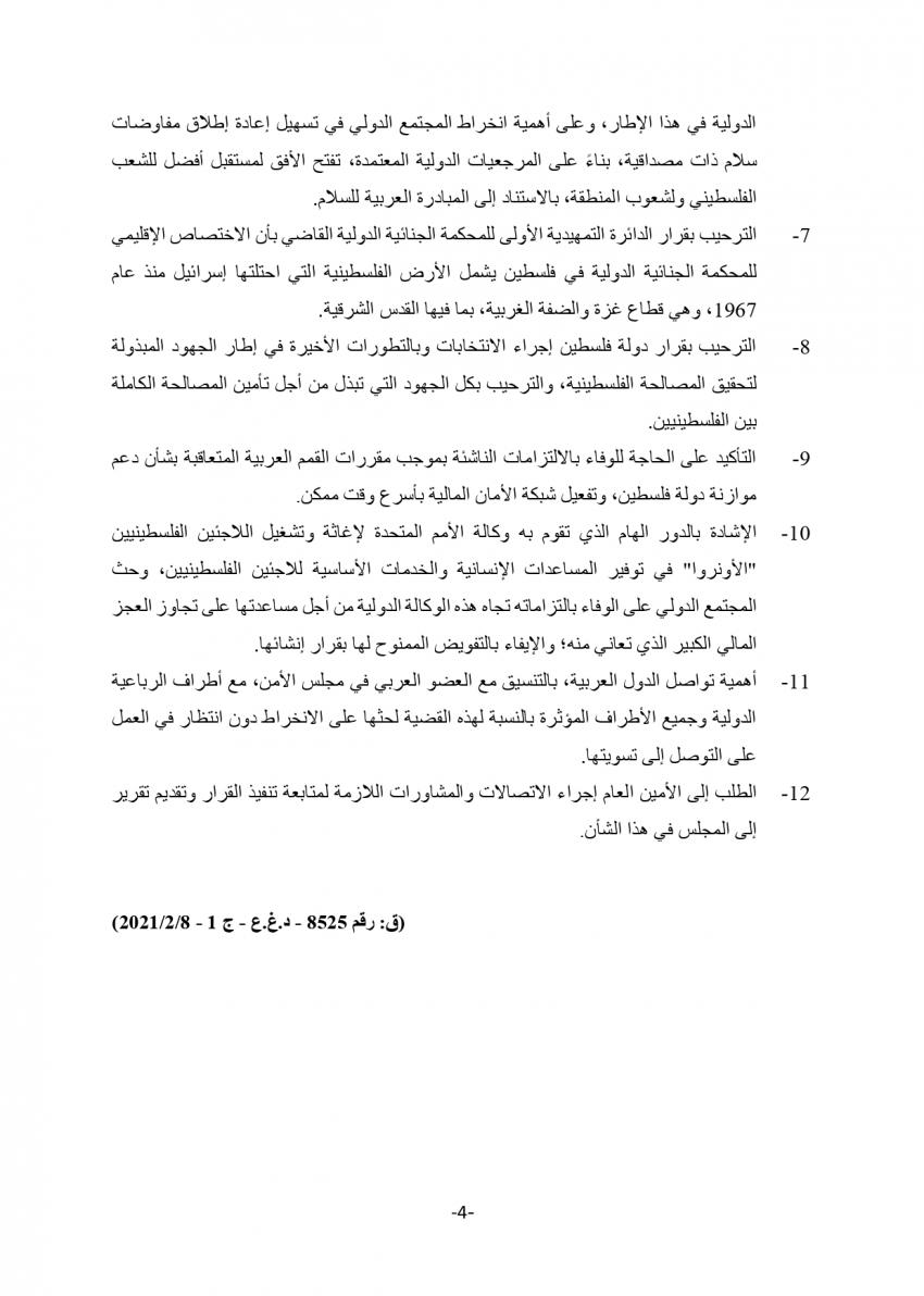 وأكد المجلس في قراره مركزية القضية الفلسطينية بالنسبة للدول العربية، مجددا التزام كافة الدول العربية بدعم حقوق الشعب الفلسطيني المشروعة وغير القابلة للتصرف وعلى رأسها تقرير المصير وحق العودة واقامة الدولة الفلسطينية المستقلة كاملة السيادة على خطوط الرابع من حزيران عام 1967 وعاصمتها القدس الشرقية، والتأكيد على ضرورة ايجاد حل عادل لقضية اللاجئين الفلسطينيين وفق قرار الجمعية العامة للأمم المتحدة.