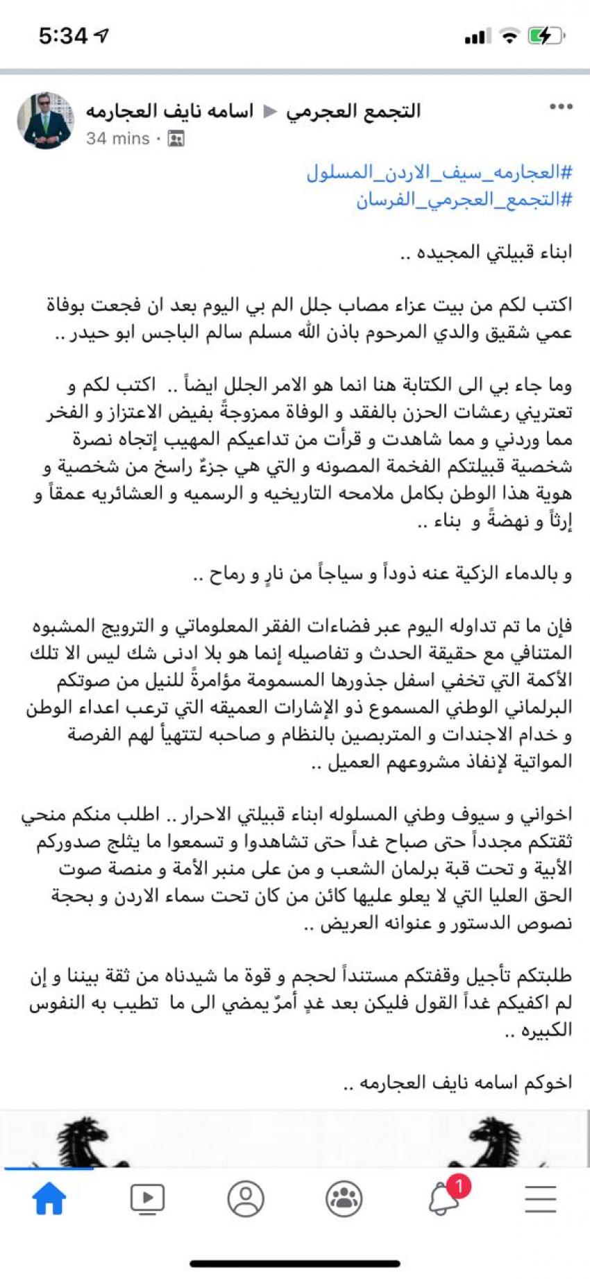 وقال العجارمة في رسالة لأبناء عشيرته "طلبت منكم تأجيل وقفتكم مستندا لحجم وقوة ما شيدناه من ثقة بيننا وإن لم أكفيكم غداً القول فليكن بعد غد أمر يمضي إلى ما تطيب به النفوس الكبيرة".