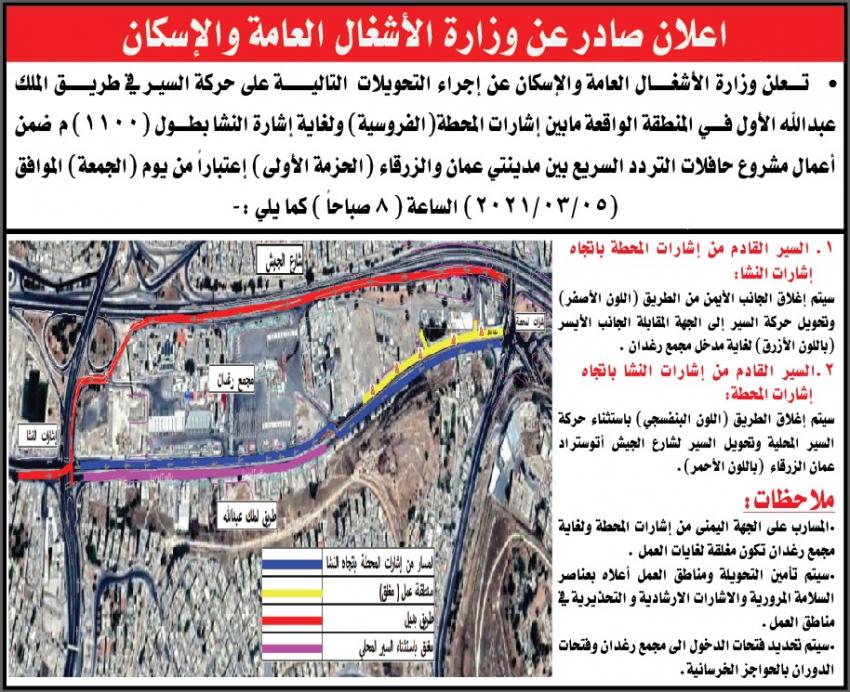 وبينت الوزارة في بيان لها الاربعاء، أنه وبالنسبة للسير القادم من إشارات المحطة بإتجاه إشارات النشا سيتم إغلاق الجانب الايمن من الطريق وتحويل حركة السير إلى الجهة المقابلة الجانب الايسر لغاية مجمع رغدان، والسير القادم من إشارات النشا باتجاه إشارات المحطة سيتم إغلاق الطريق باستثناء حركة السير المحلية وتحويل السير لشارع الجيش اتوستراد عمان - الزرقاء.