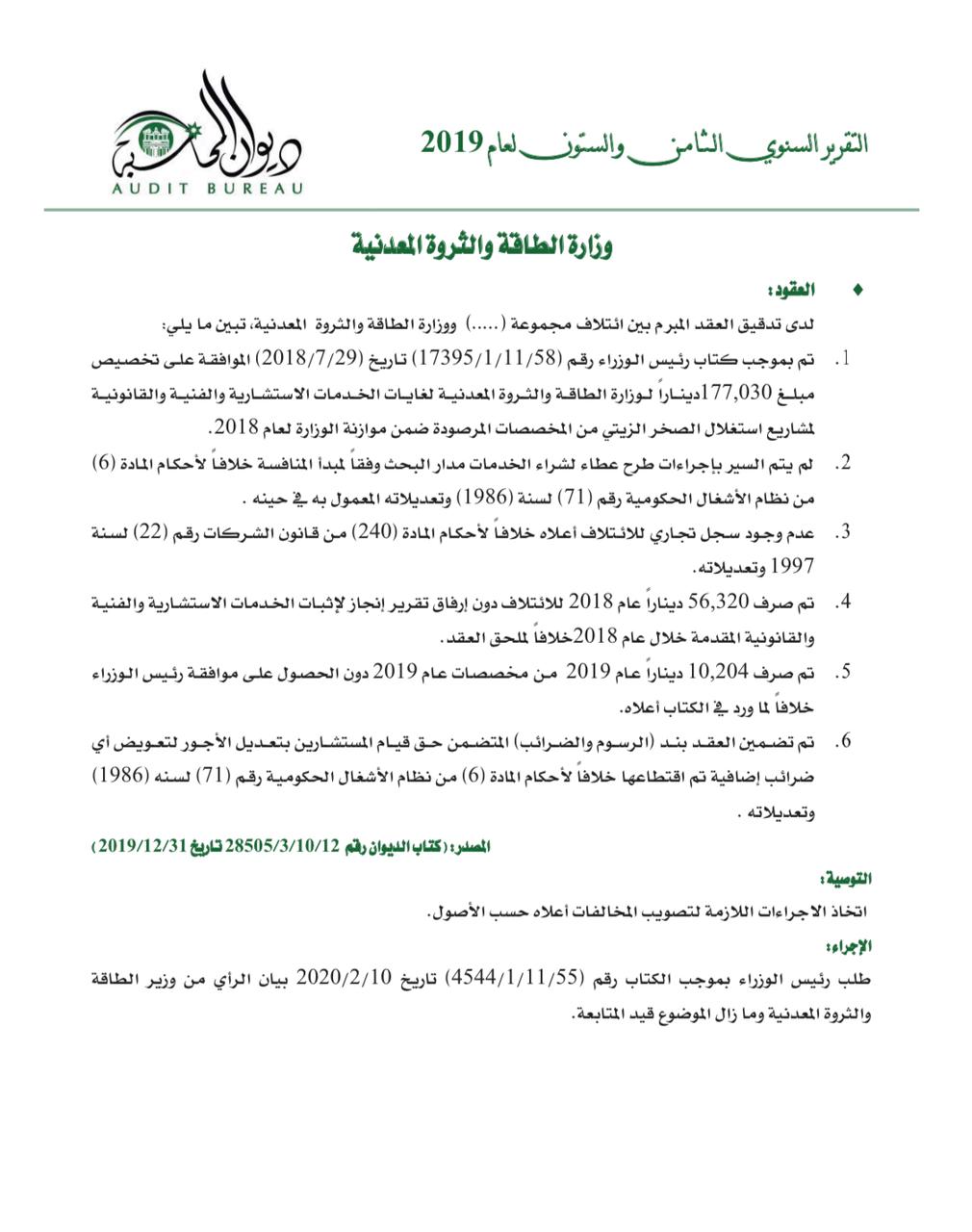 وطلب رئيس الوزراء بموجب الكتاب رقم (4544/1/11/55) تاريخ 10/2/2020 بيان الرأي من وزيرة الطاقة ولا زالت المتابعة مستمرة ، كما ذكر تقرير ديوان المحاسبة الاخير.