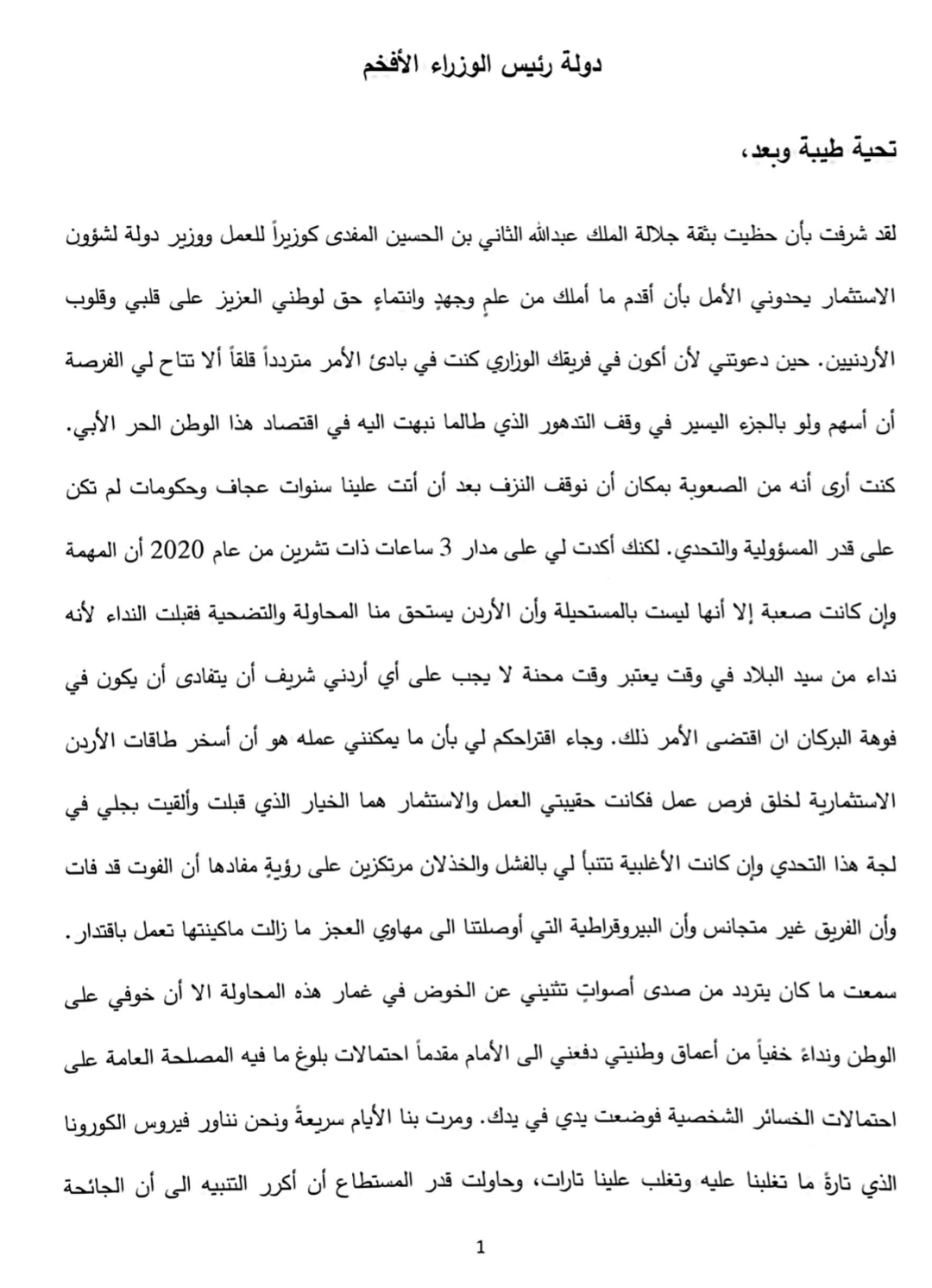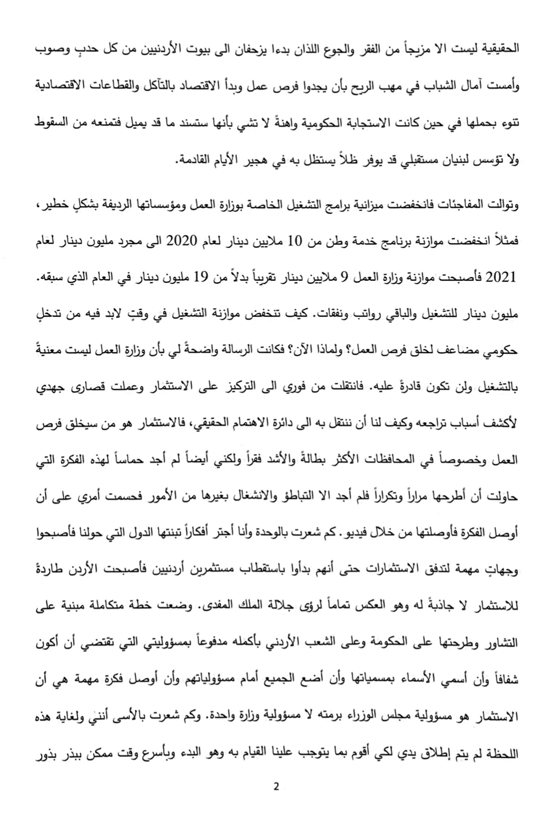 حصلت وكالة اخبار البلد على النص الكامل لاستقالة الوزير معن القطامين من الحكومة وتاليها النص الكامل: