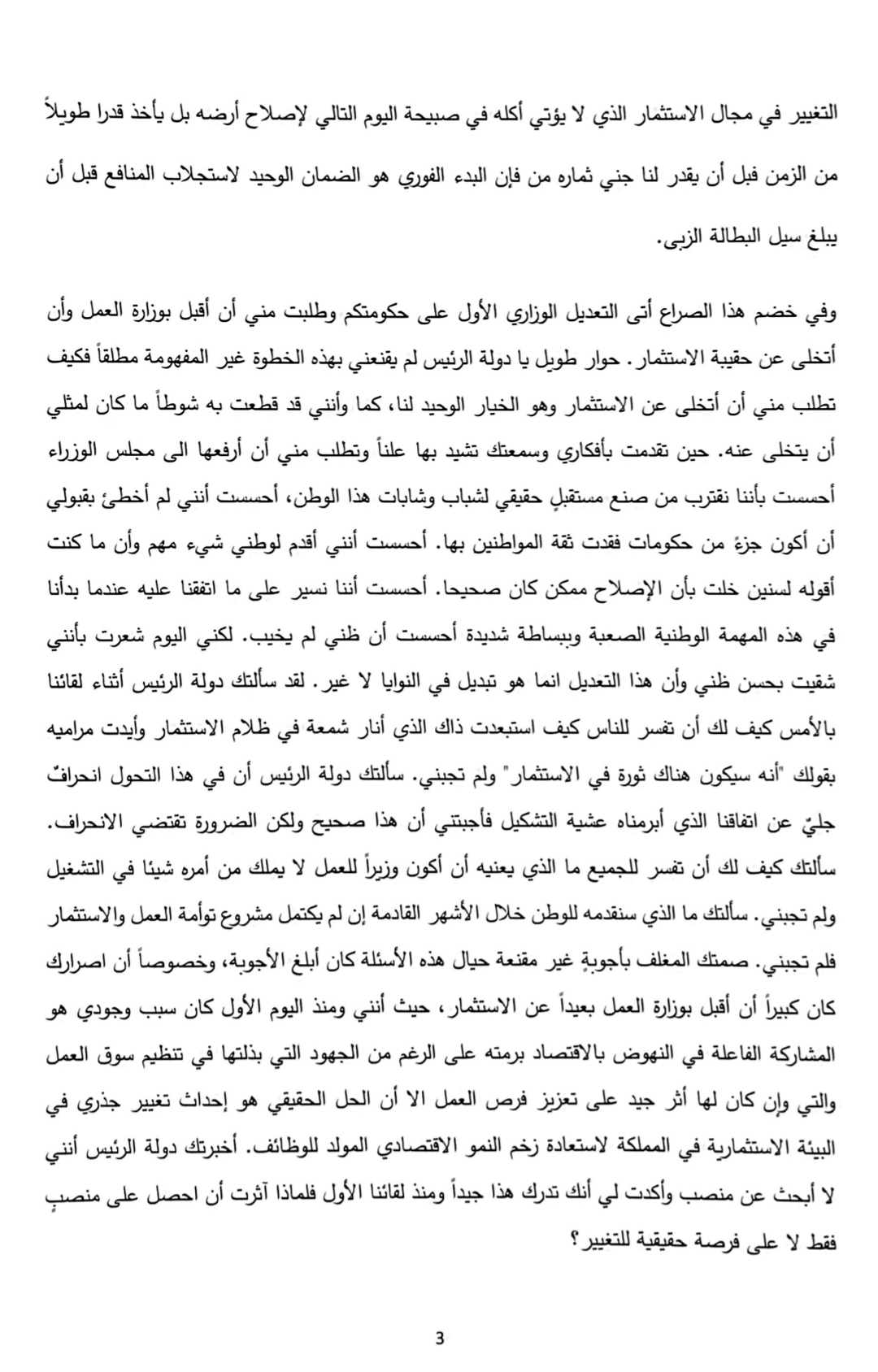 حوار طويل مع دولة الرئيس لم يقنعني بأن اتخلى عن حقيبة الاستثمار الذي هو خيارنا الوحيد للتشغيل