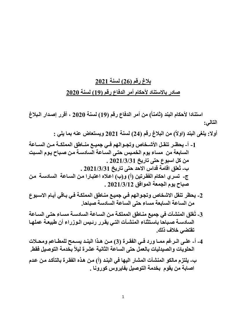 أصدر رئيس الوزراء الدكتور بشر الخصاونة الأربعاء، البلاغ رقم 26 لسنة 2021 والصادر بالاستناد لأحكام أمر الدفاع رقم 19 لسنة 2020.