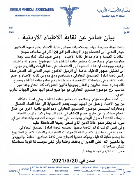 أخبار البلد - اخبار البلد- اصدرت نقابة الاطباء الاردنيين بيانا هاما ، السبت ، بعدما علمت لجنة ممارسة مهام و صلاحيات مجلس نقابة الاطباء بخبر دعوة الدكتور حيدر المدني الى الاعتصام يوم الاربعاء 24 اذار في ساحة مجمع النقابات المهنية وامام مدخل نقابة الاطباء وتاليا نص البيان :