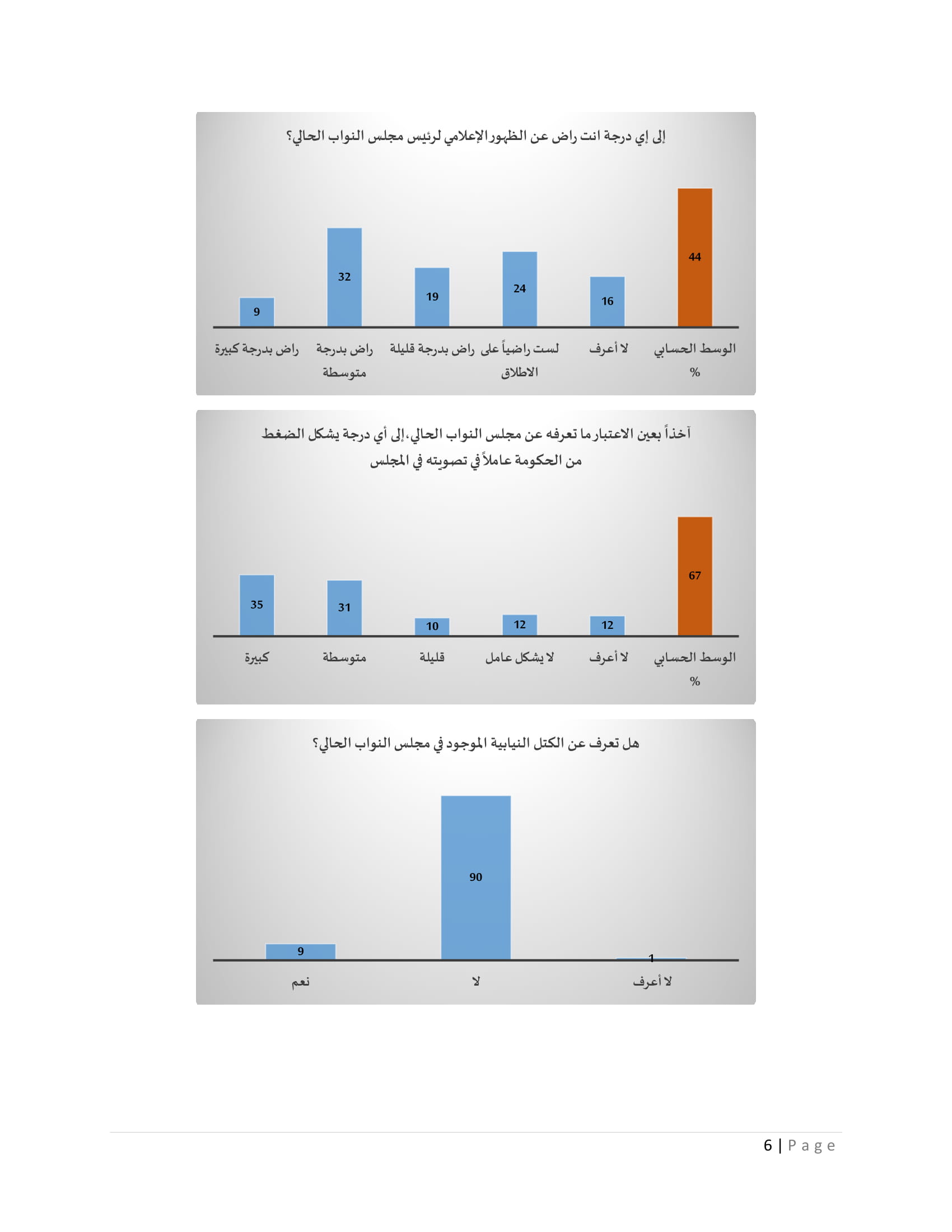 وأبدى 44% من الأردنيين رضاهم عن الظهور الإعلامي لرئيس مجلس النواب الحالي، ومع ذلك، مازال ثلثا الأردنيين (67%) يعتقدون أن الحكومة وأجهزتها تمارس الضغط على مجلس النواب في مجالات التصويت وتمرير القوانين والتشريعات.