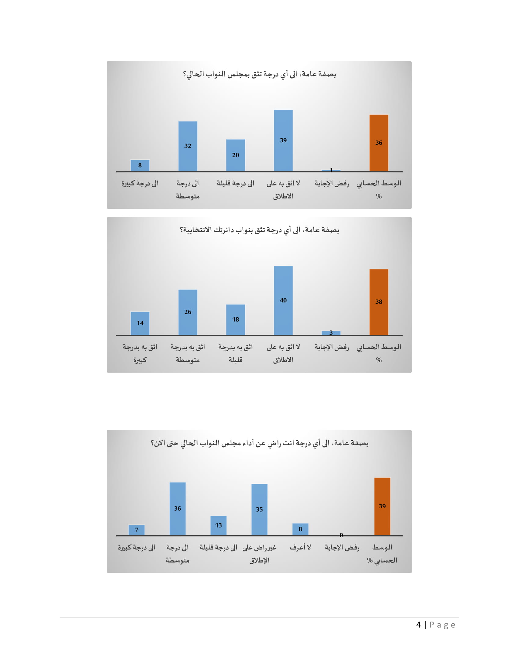 وأبدى 39% من الأردنيين رضاهم عن أداء مجلس النواب الحالي، و37% رضاهم عن أداء نواب دائرتهم الانتخابية وهي أعلى نسبة رضى عن أداء مجلس النواب منذ العام 2014.