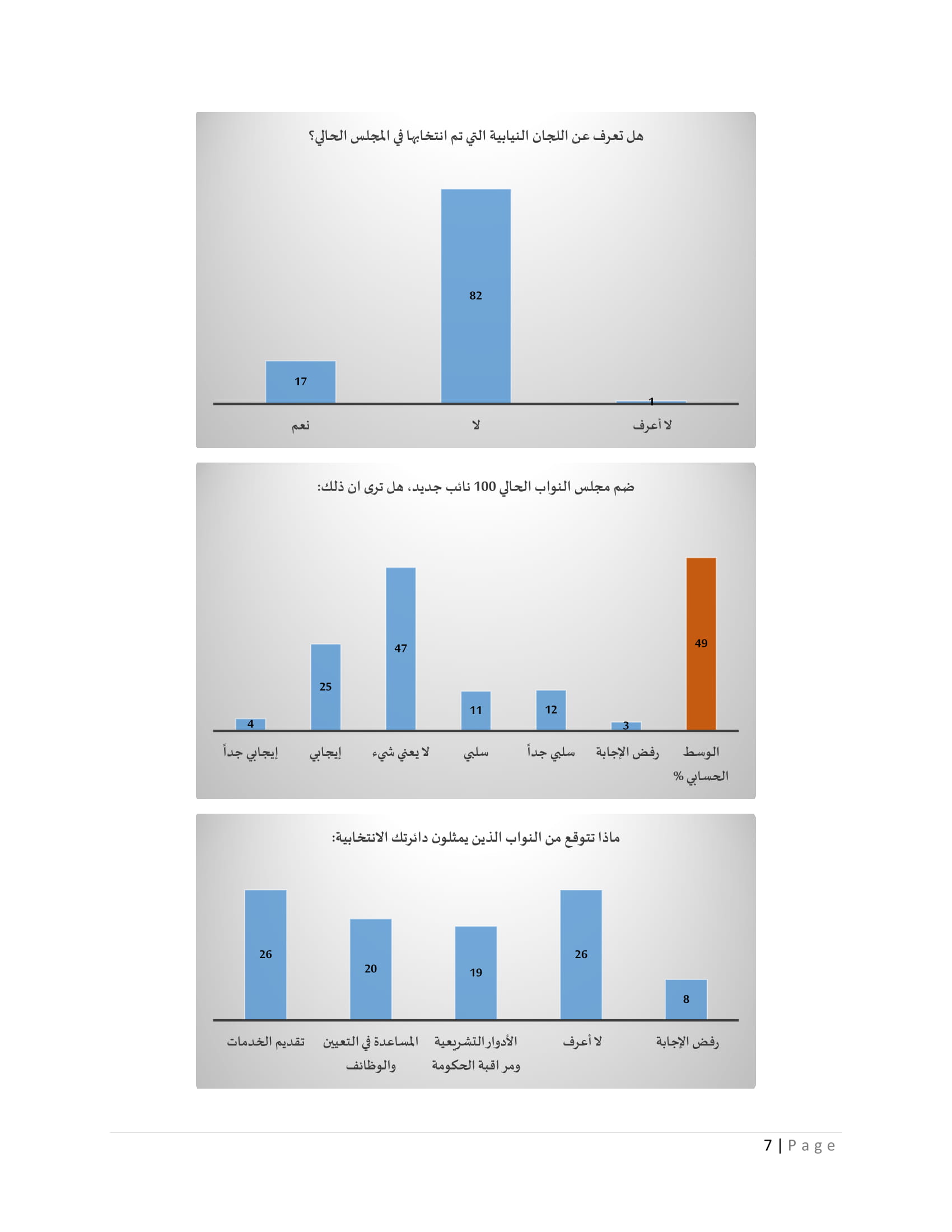وأشارت إلى وجود 100 نائب جديد في البرلمان الحالي لا يعني شيئاً على الاطلاق عند نصف الأردنيين تقريباً (47%)، ويتوقع (58%) من الأردنيين من نواب دائرتهم الانتخابية تقديم الخدمات والمساعدة في التعيين والوظائف، فيما يتوقع (19%) فقط منهم القيام بالأدوار التشريعية ومراقبة الحكومة، فيما بين الاستطلاع أن ثلث الأردنيين (34%) لا يعرفون اسم أي من النواب الحاليين في مجلس النواب.