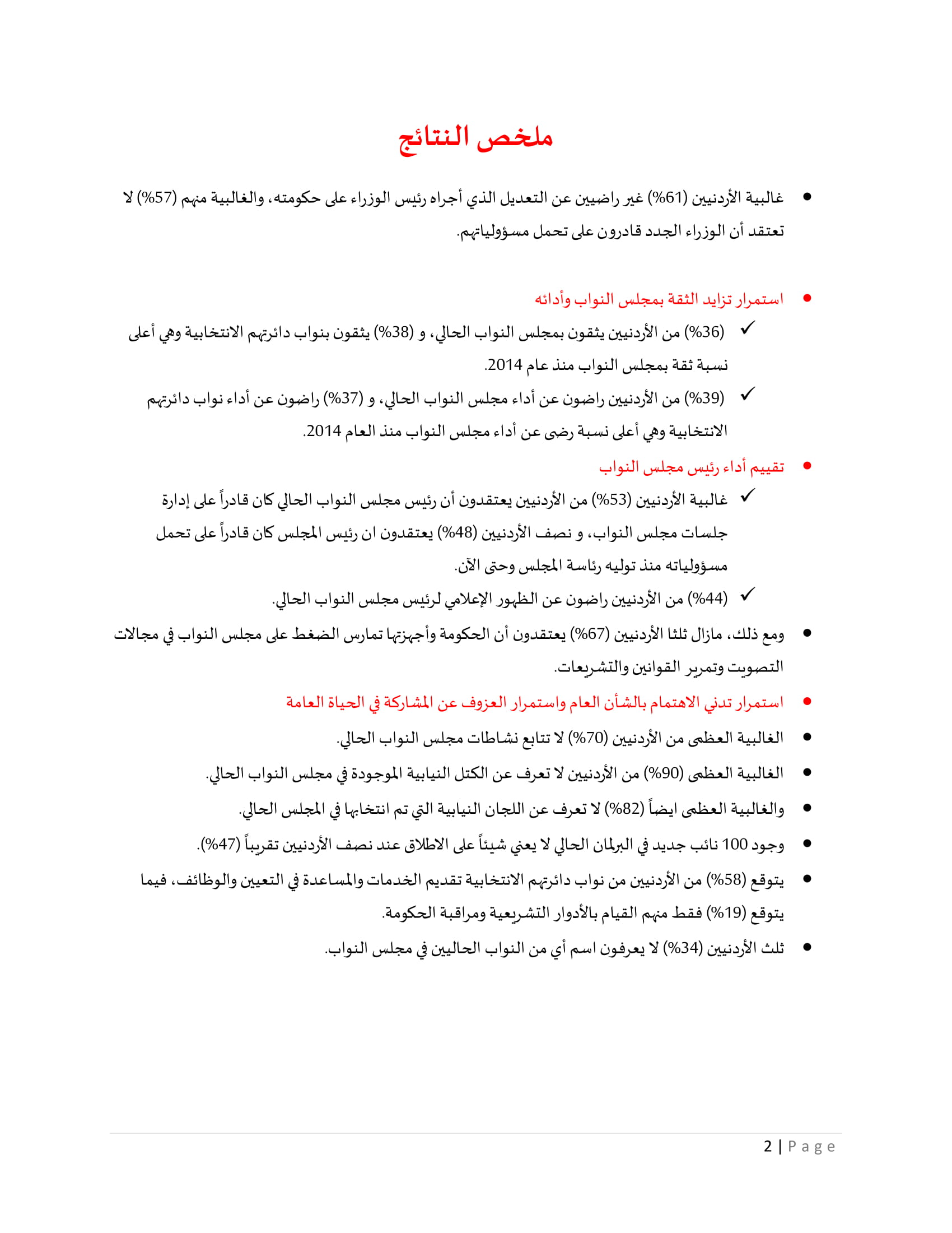 وتلخصت نتائج الاستطلاع باستمرار تدني الاهتمام بالشأن العام واستمرار العزوف عن المشاركة في الحياة العامة، وأن الغالبية العظمى من الأردنيين (70%) لا تتابع نشاطات مجلس النواب الحالي، فيما لا تعرف الغالبية العظمى (90%) من الأردنيين عن الكتل النيابية الموجودة في مجلس النواب الحالي، والغالبية العظمى أيضا (82%) لا تعرف عن اللجان النيابية التي تم انتخابها في المجلس الحالي.