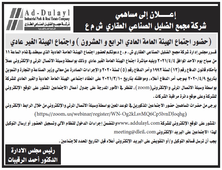 قرر مجلس ادارة شركة مجمع الضليل الصناعي العقاري دعوة المساهمين لحضور اجتماع الهيئة العامة العادية والذي سيعقد في تمام الساعة 11 من صباح يوم الاحد الموافق 4/4/2021 ويليه مباشرة اجتماع الهيئة العامة الغير عادي ، وذلك بواسطة وسيلة الاتصال المرئي والالكتروني عملاً باحكام قانون الدفاع رقم (13) لسنة 1992 وامر الدفاع رقم (5) لسنة 2020 والاجراءات الصادرة عن معالي وزيرة الصناعة والتجارة والتموين المهندسة مها العلي بتاريخ 9/4/2020 بموجب امر الدفاع اعلاه وموافقته بتاريخ 10/3/2021 على انعقاد اجتماعي الهيئة العامة العادية والغير عادية للشركة بواسطة وسيلة الاتصال المرئي والالكتروني (ZOOM) للنظر في الامور المدرجة على جدول اعمال الاجتماعين المنشور على الموقع الالكتروني للشركة وعلى موقع دائرة مراقبة الشركات .