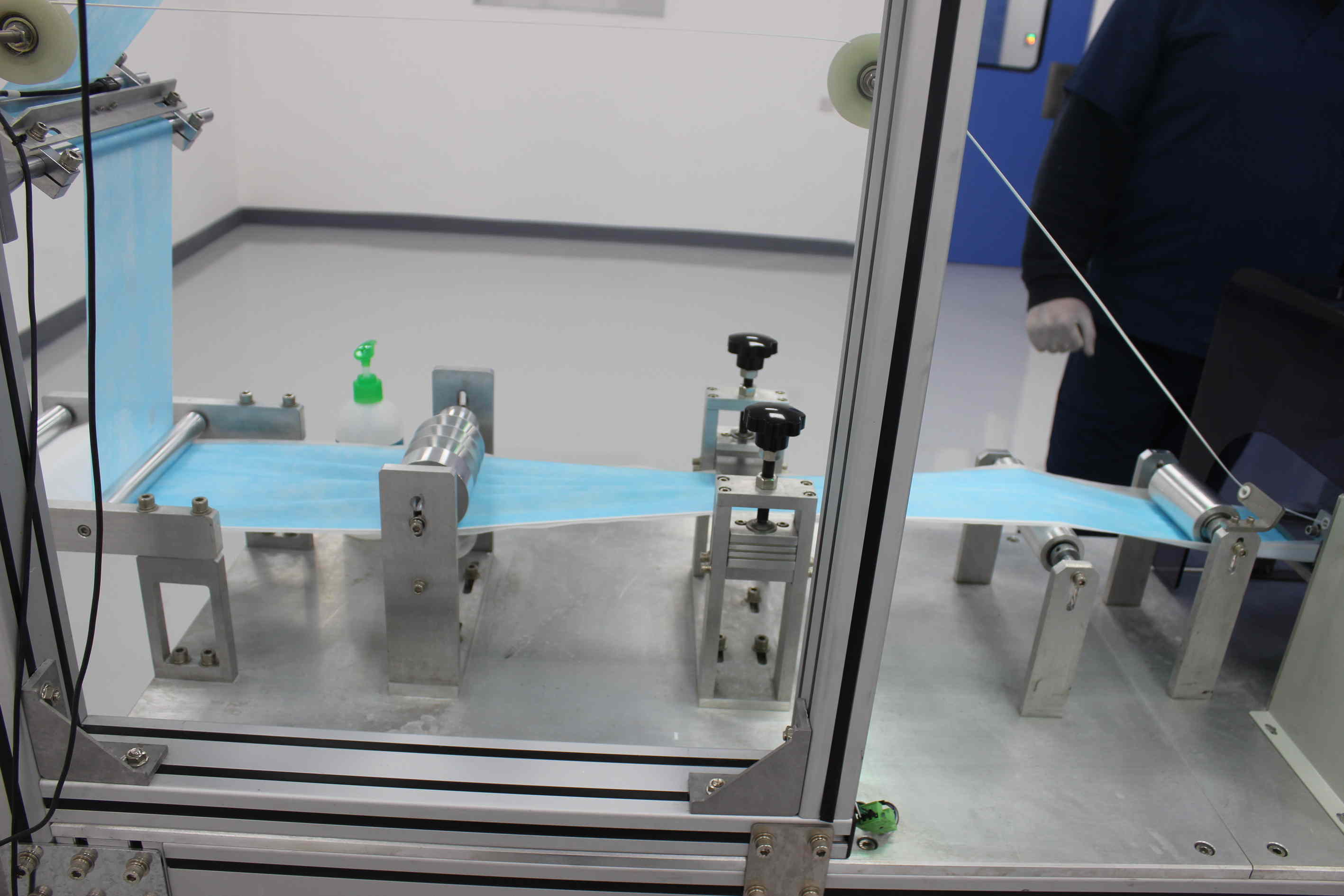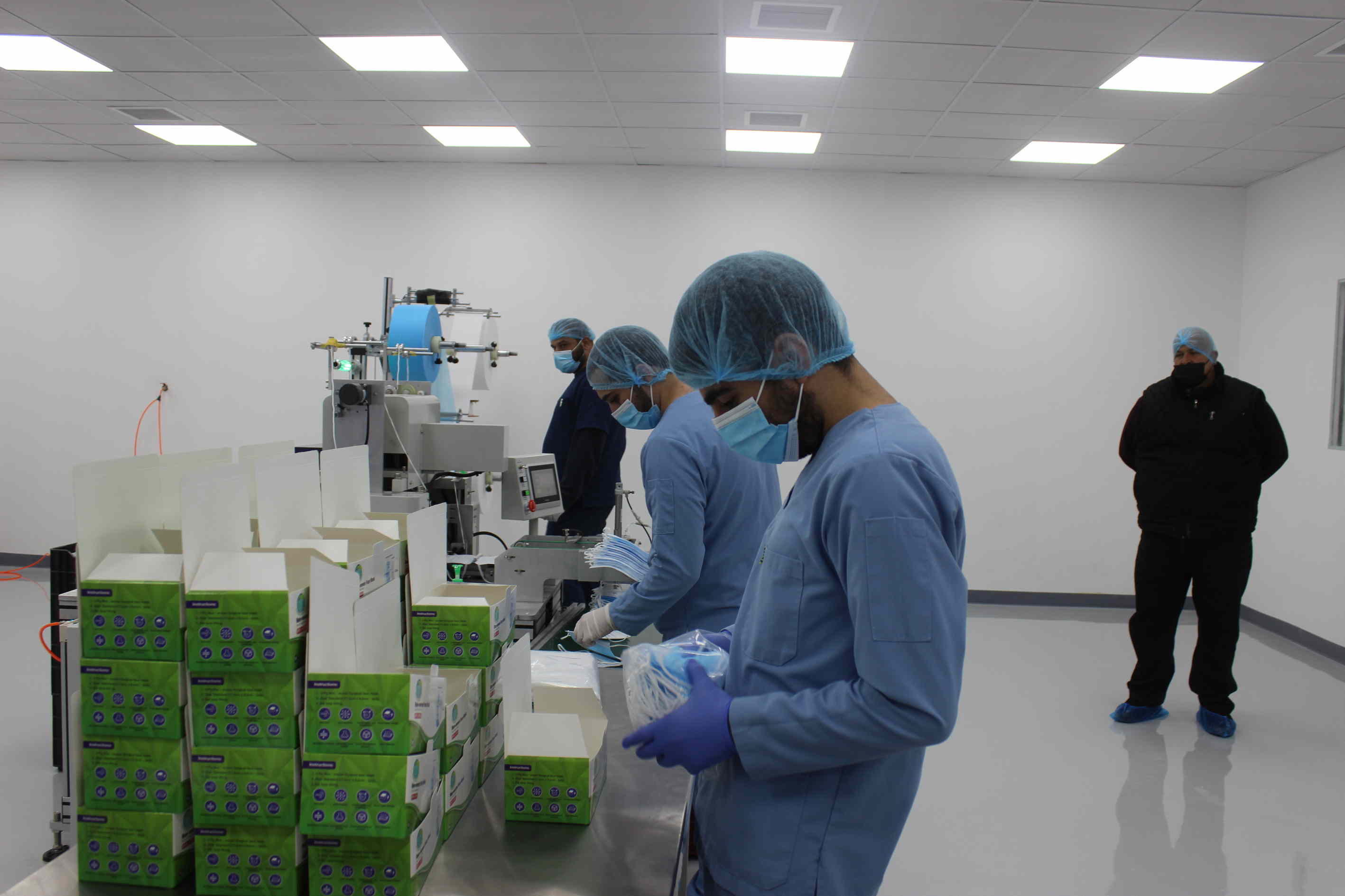 واطلعت "اخبار البلد" اثناء جولتها في مصنع الشركة على طريقة تصنيع الكمامات والمراحل التي تمر بها وطريقة عمل الموظفين والالتزام التام بالنظافة والتعقيم وشروط الصحة والسلامة العامة حيث يبدأ الموظف يوم عمله بالدخول من باب المصنع فيجد غرفة الغيار حيث يرتدي ملابس العمل ثم يقوم بالدخول الى الغرفة التالية والتي يقوم فيها بارتداء غطاء الرأس والقدم والقفازات ثم يدخل الى مكان التصنيع ليباشر عمله .