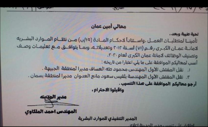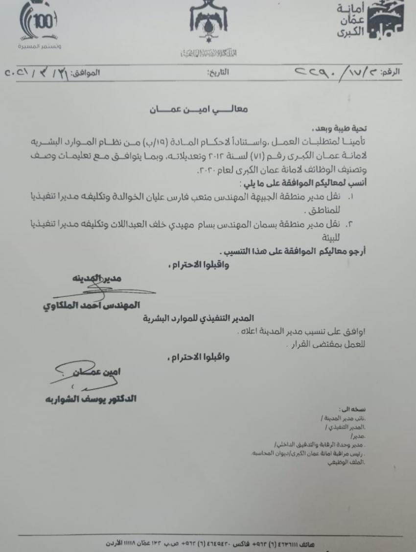 ونقل المفتش الأول المهندس محمود طه العساف مديراً لمنطقة الجبيهة، ونقل المفتش الأول المهندسة بلقيس سعود مانع العدوان مديراً لمنطقة بسمان.
