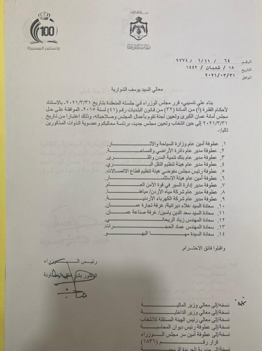 أخبار البلد - اخبار البلد- شكل رئيس الوزراء الدكتور بشر الخصاونة الأربعاء، لجنة مؤقتة لادارة أمانة عمان برئاسة أمين عمان يوسف الشواربة.