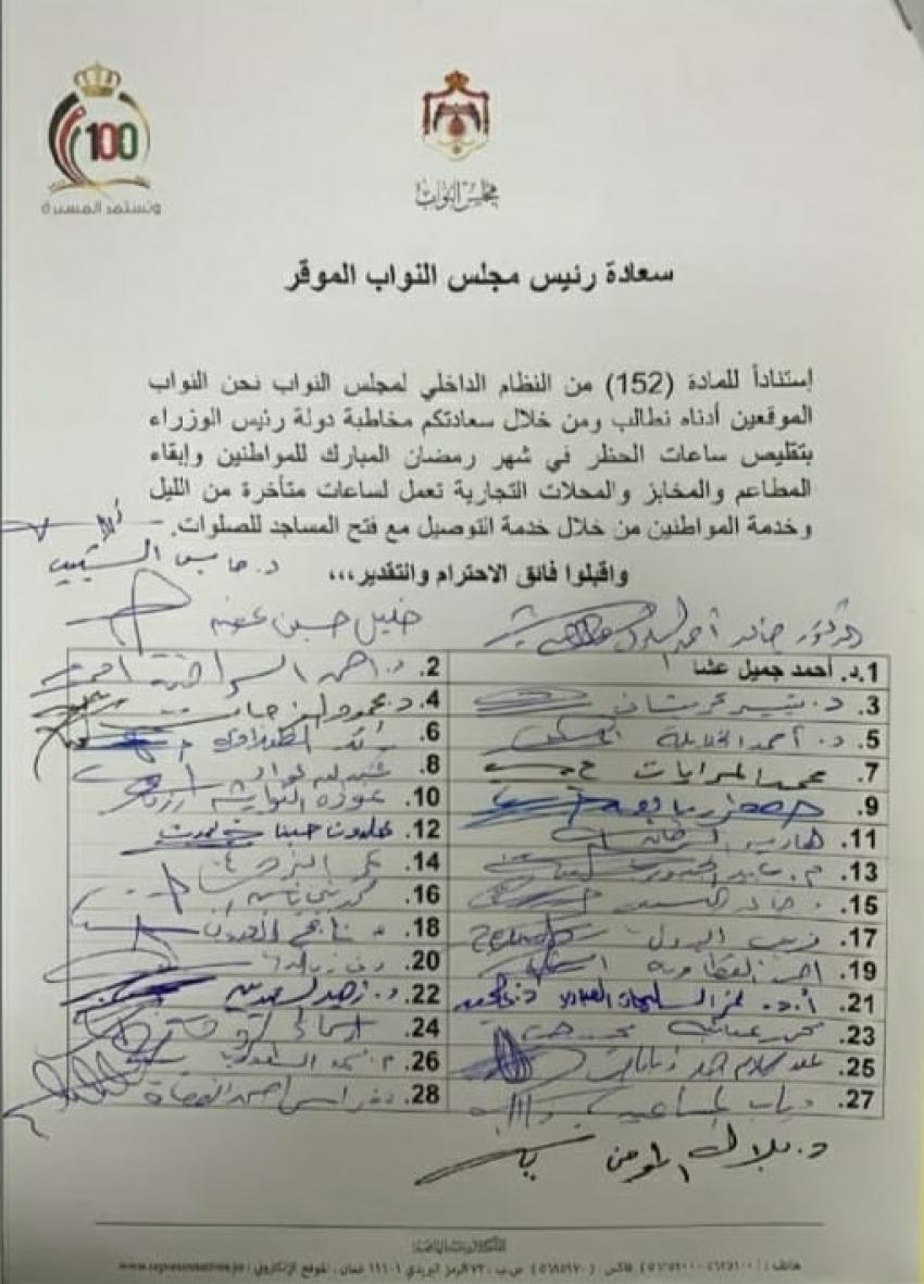 اخبار البلد - طالب 45 نائبا في مذكرة نيابية تبناها النائب أحمد جميل عشا، الحكومة بتقليص ساعات الحظر في شهر رمضان المبارك، وفتح المساجد لاداء الصلاوات.