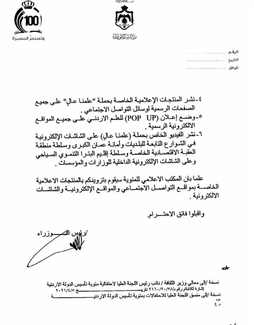 كما طالب الخصاونة برفع العلم في مختلف الشوارع من قبل البلديات وامانة عمان الكبرى وسلطة اقليم العقبة الخاصة والبترا التنموي السياحي.