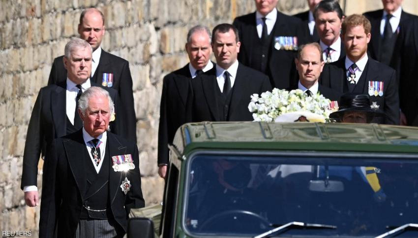 ومشى أولاد الأمير الراحل الأربعة تشارلز وآن وأندرو وإدوارد، خلف النعش، بعد تأدية الحرس الملكي التحية له، يرافقهم حفيداه وليام وهاري.