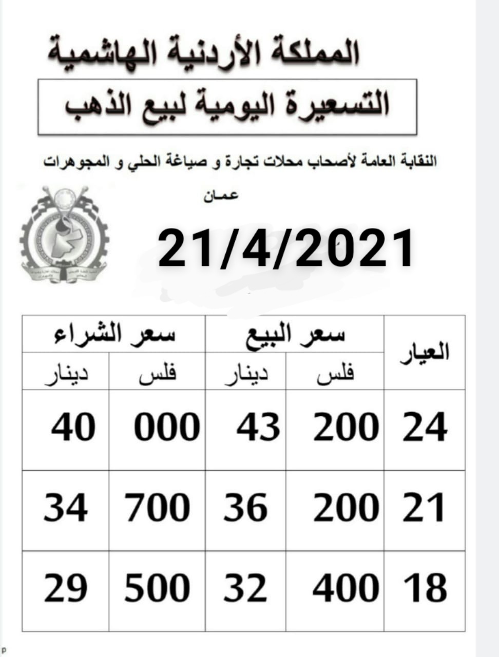 وبحسب التسعيرة اليومية لأصحاب محلات تجارة وصياغة الحلي والمجوهرات، بلغ سعر بيع الغرام من الذهب عياري 24 و18 لغايات الشراء من محلات الصاغة عند 43.20 و32.40 دينارا على التوالي.