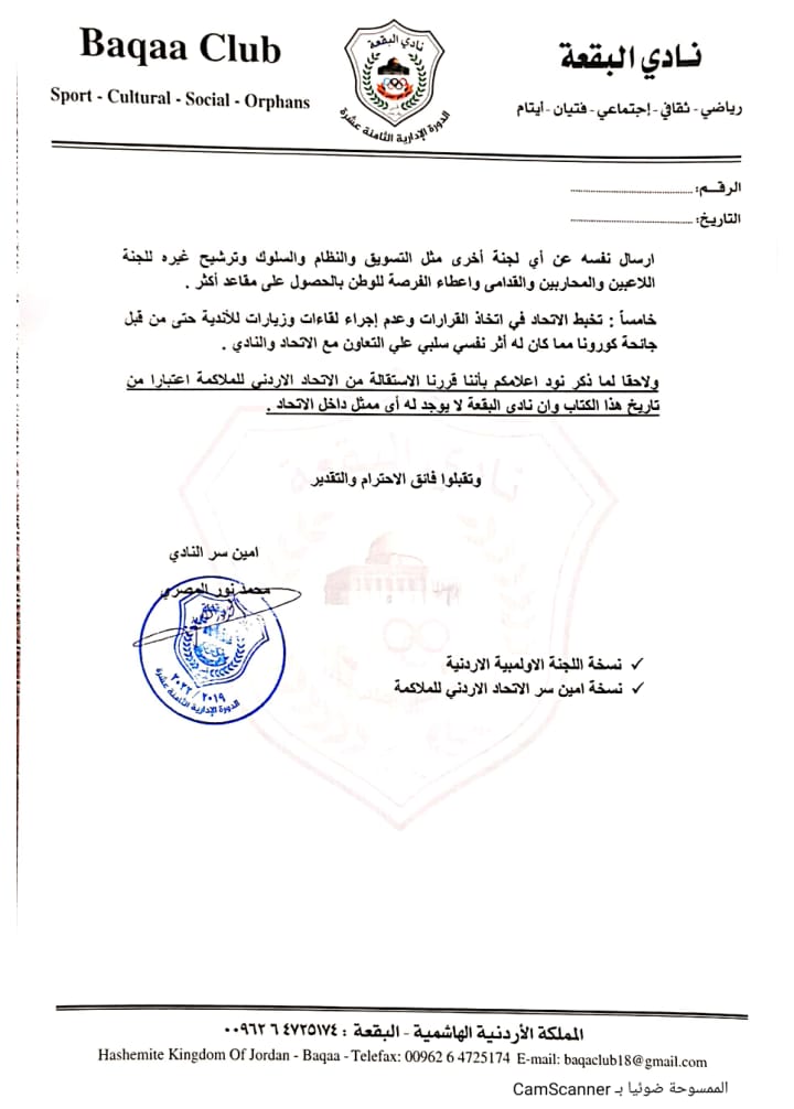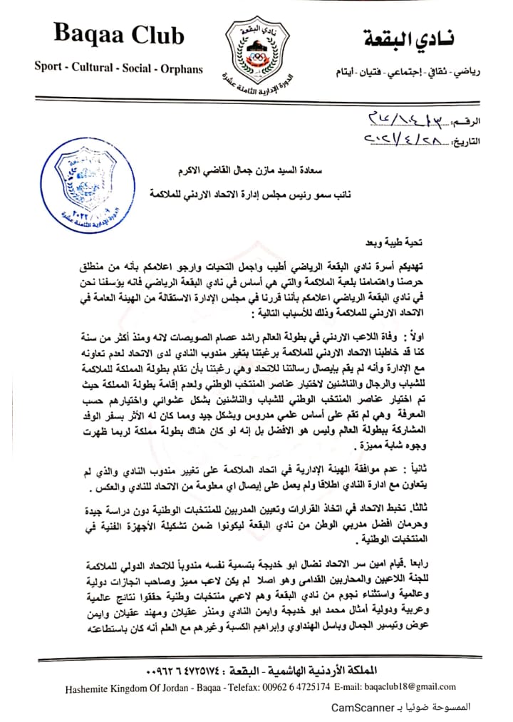 تحية طيبة وبعد تهديكم أسرة نادي البقعة أطيب وأجمل التحيات وارجو اعلامكم بانه من منطلق حرصنا واهتمامنا بلعبة الملاكمة والتي هي اساس في نادي البقعة الرياضي فانه يؤسفنا نحن في نادي البقعة الرياضي اعلامكم باننا قررنا في مجلس الادارة الاستقالة من الهيئة العامة في الاتحاد الاردني للملاكمة وذلك للاسباب التالية.