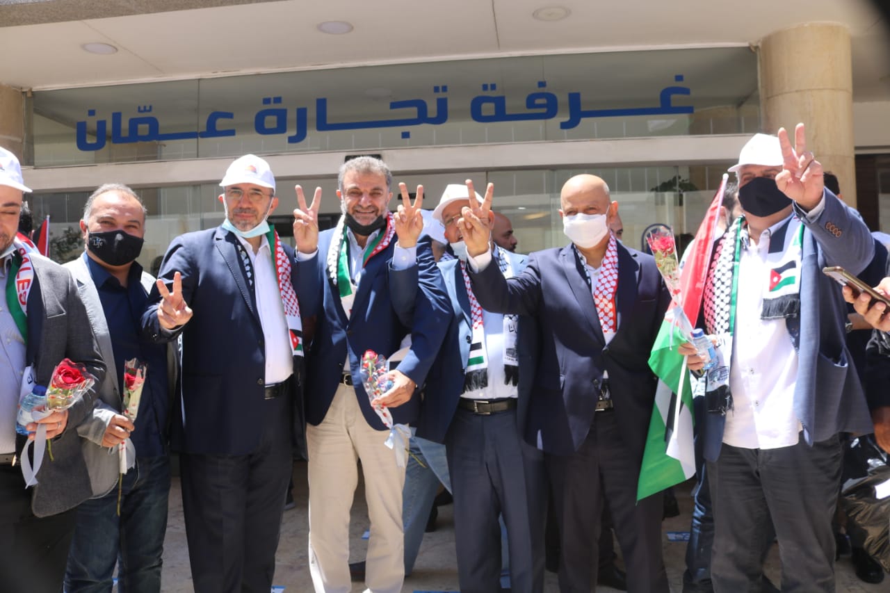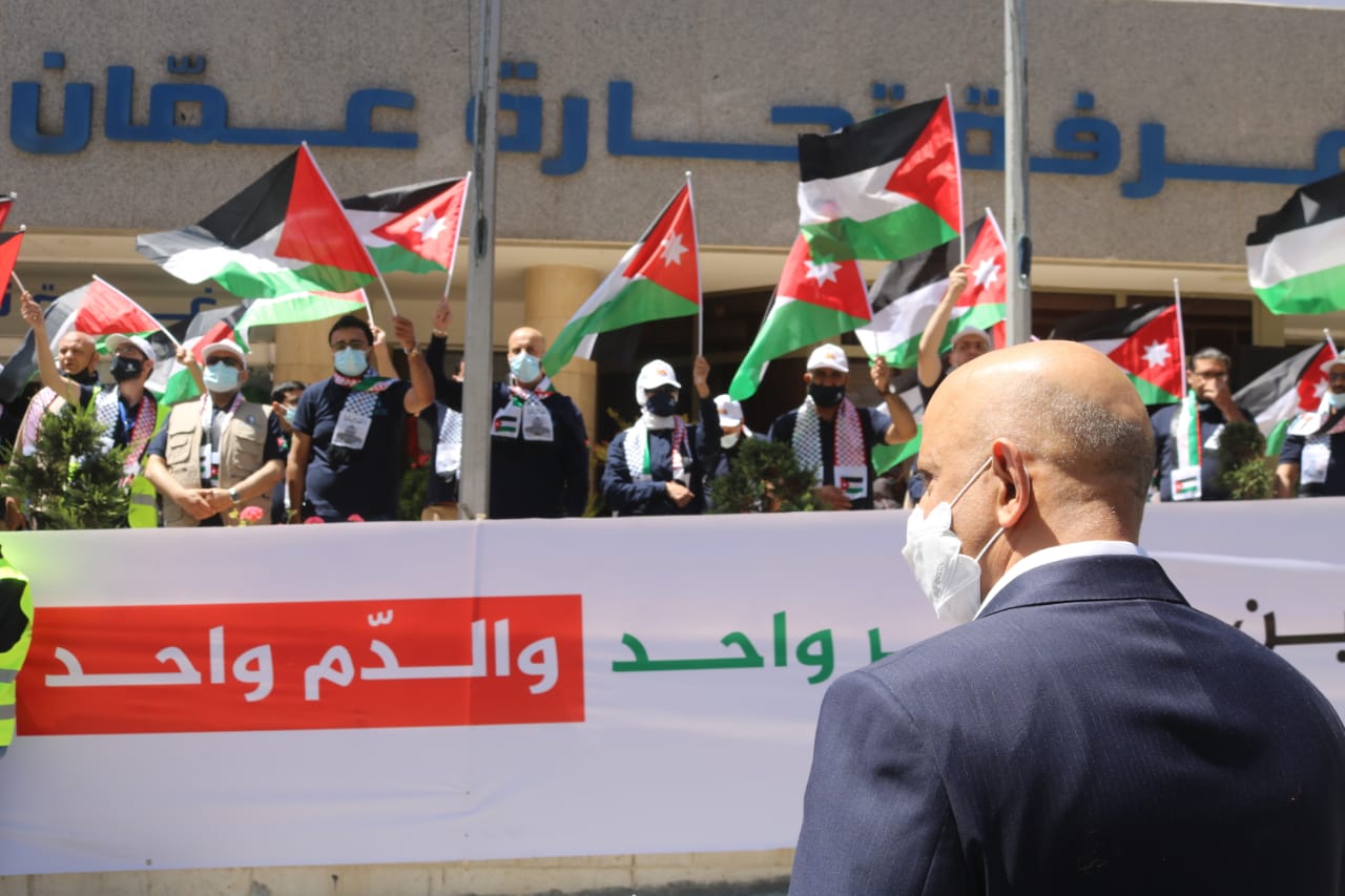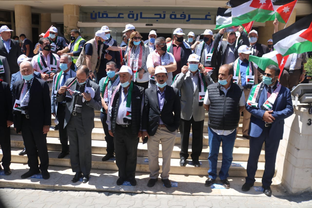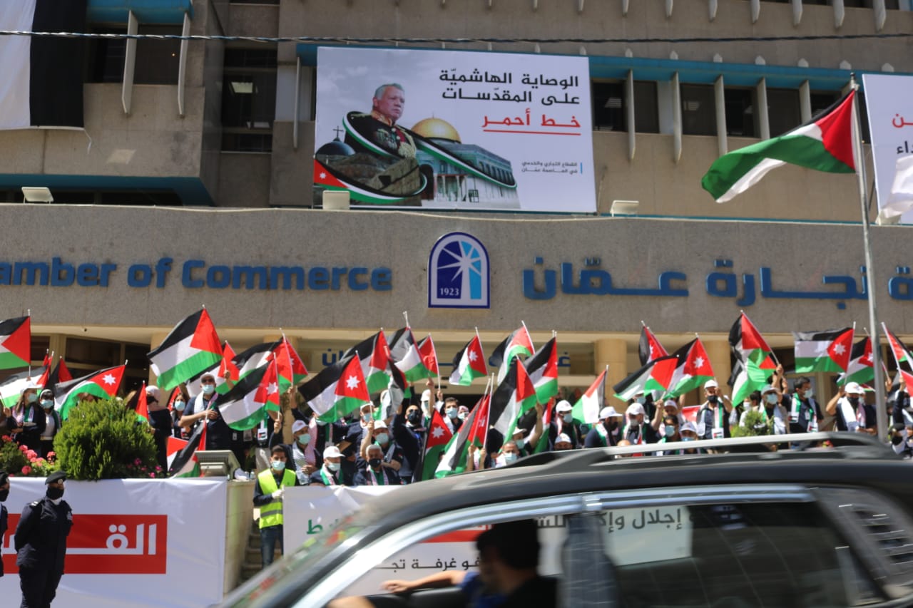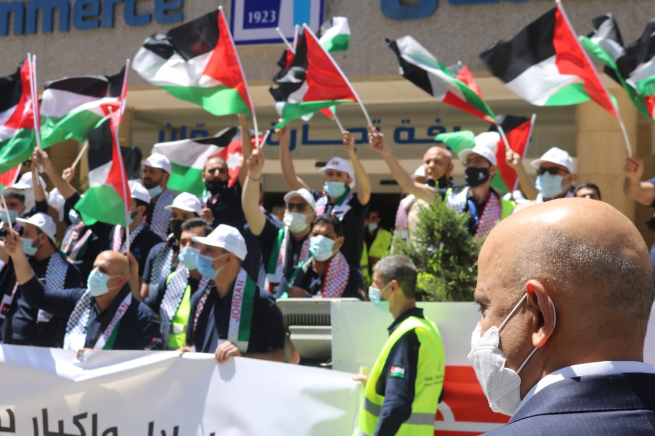 وكانت إدارة الغرفة قد قامت برصف أرضية ساحة الوقفة بالعلم الصهيوني الذي داسته الأقدام بخطوة لاقت تأييد وإعجاب الحضور الذين هتفوا للأردن وفلسطين على وقع الأغاني الوطنية الحماسية .