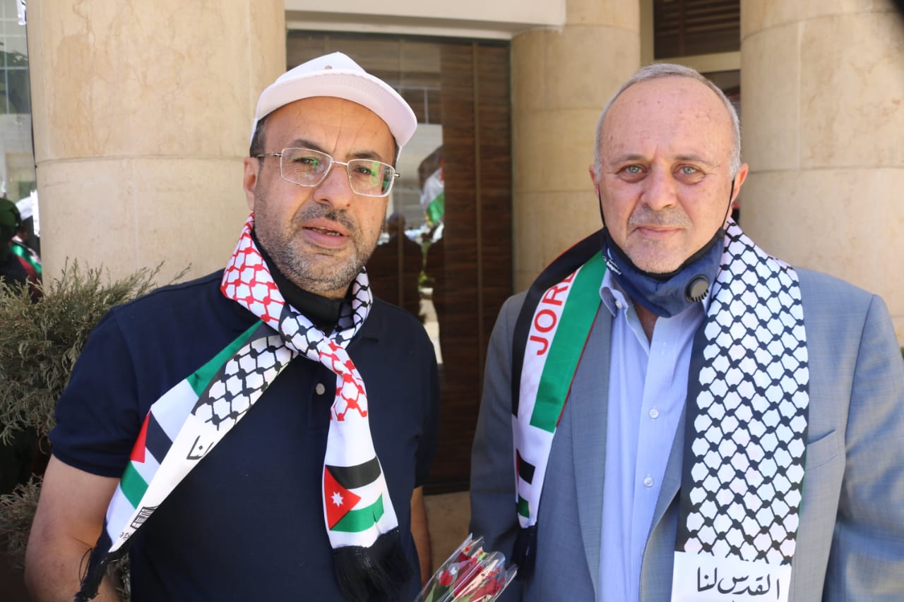 وأشاد المشاركون في الوقفة التي استمرت لأكثر من ساعة وتخللها توزيع الأعلام الأردنية والفلسطنية التي ارتفعت في السماء، وتوزيع الورود على كل المشاركين ابتهاجًا في النصر العظيم كما تم توزيع الحلويات والكنافة على المشاركين بالإضافة للفحات مزينة بالعلمين الأردني والفلسطيني مذيلة بشعار القدس لنا، وقام الجميع بوضعها على رؤسهم بمنظر بهي وزاهي.
