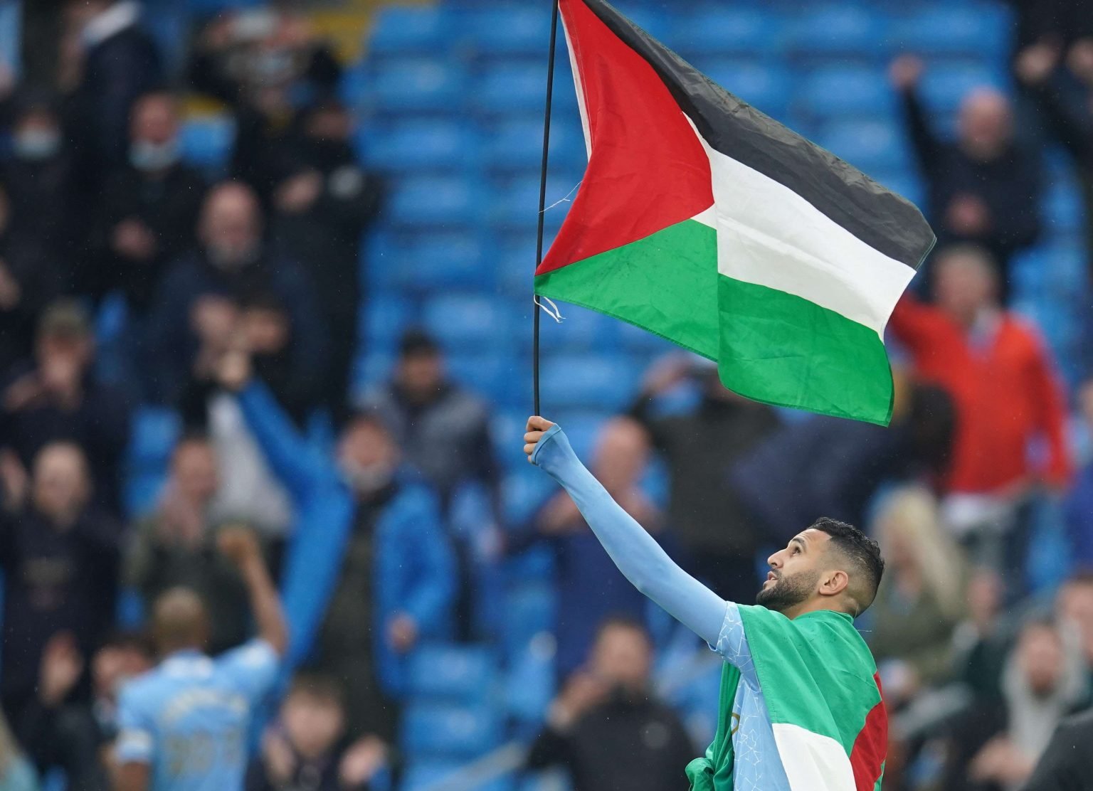 رفع النجم الجزائري رياض محرز علم فلسطين أثناء الاحتفالات بتتويج فريقه مانشستر سيتي بلقب الدوري الإنكليزي.