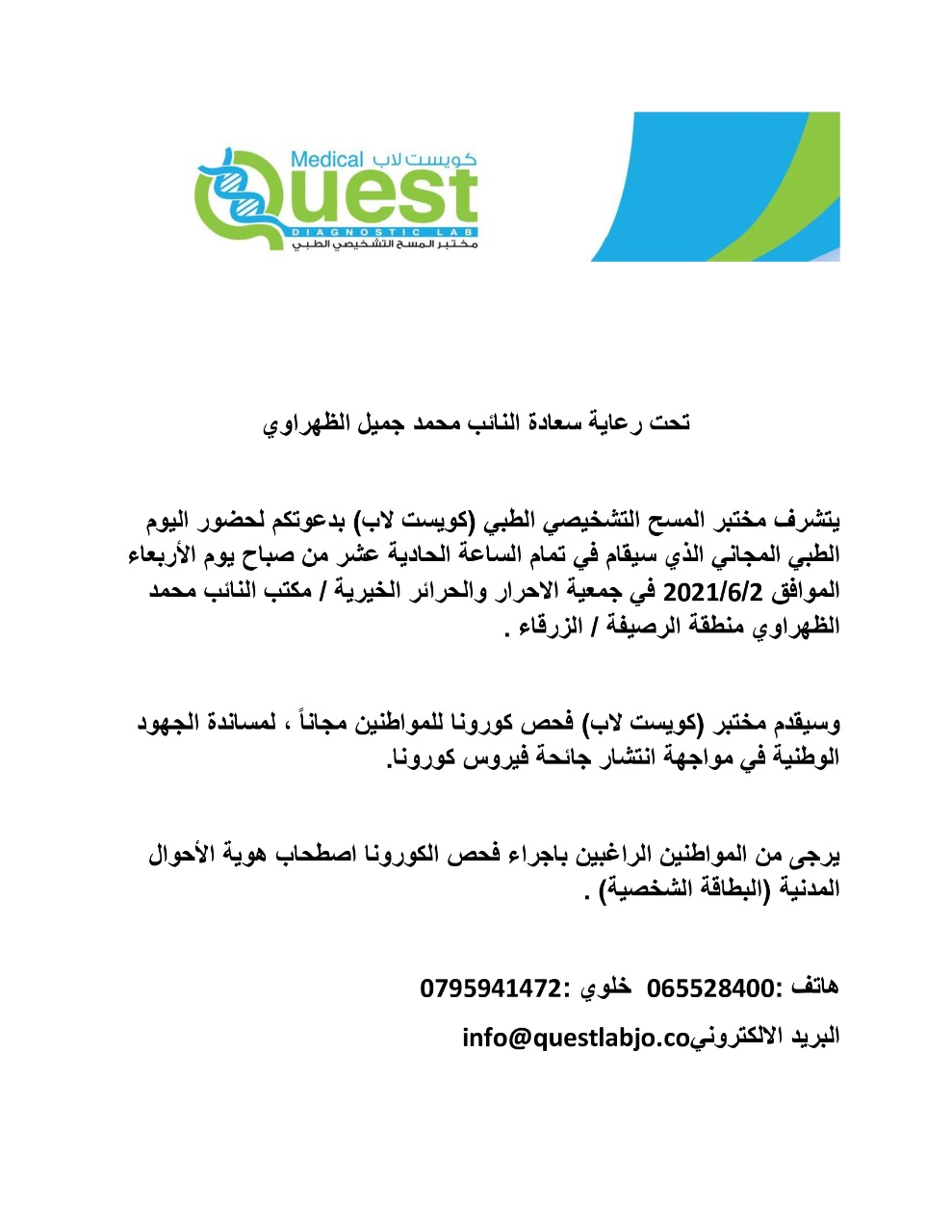 تحت رعاية رئيس لجنة فلسطين النيابية النائب محمد جميل الظهراوي ، يقيم مختبر المسح التشخيصي الطبي (كويست لاب) يوم طبي مجاني في جمعية الاحرار والحرائر الخيرية / مكتب النائب محمد الظهراوي في منطقة الرصيفة / مدينة الزرقاء ، وذلك في تمام الساعة الحادية عشر من ظهر يوم الاربعاء القادم الموافق 2/6/2021 .