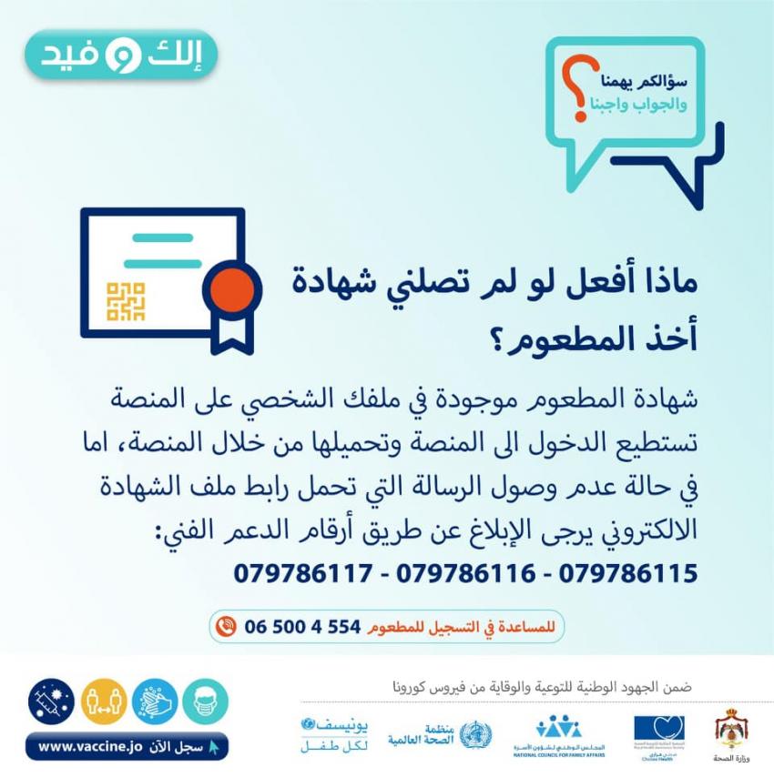 كما دعت الوزارة كل من لم تصله شهادة أخذ المطعوم، الدخول إلى ملفهم عن طريق المنصة وتحميلها من خلالها، أما في حالة عدم وصول رسالة تحمل رابط ملف الشهادة الالكترونية فيجب الابلاغ عن طريق أرقام الدعم الفني.