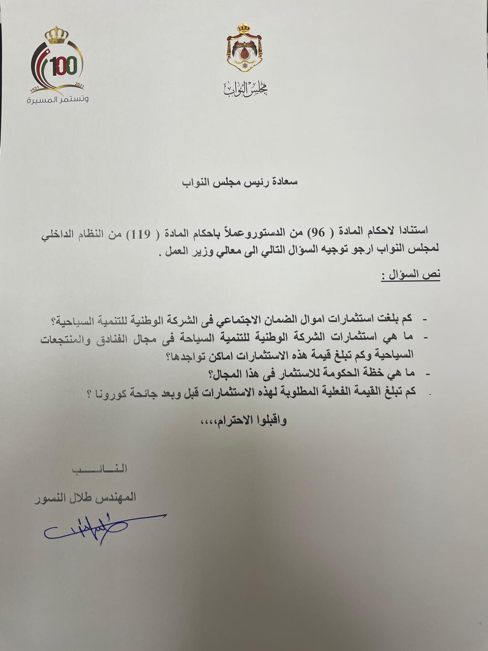 ارسل النائب طلال نسور بوابل من الأسئلة إلى صندوق استثمار أموال الضمان الاجتماعي والتي يتفرغ عنها الشركة الوطنية للتنمية السياحية .