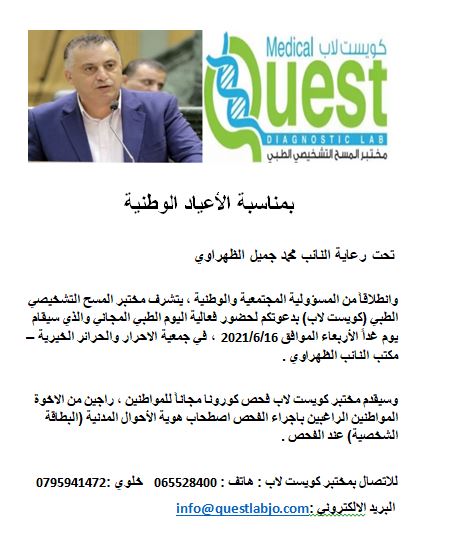 بمناسبة الاعياد الوطنية ، وتحت رعاية رئيس لجنة فلسطين النيابية النائب محمد جميل الظهراوي ، يقيم مختبر المسح التشخيصي الطبي (كويست لاب) يوم طبي مجاني في جمعية الاحرار والحرائر الخيرية / مكتب النائب محمد الظهراوي في منطقة الرصيفة / مدينة الزرقاء ، وذلك في تمام الساعة الحادية عشر من ظهر يوم غداً الاربعاء الموافق 16/6/2021 .