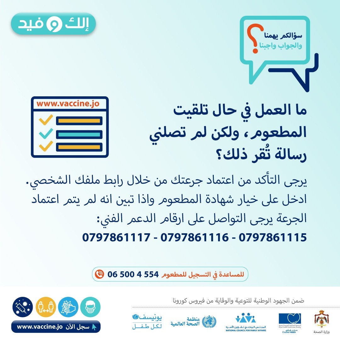 وردا على سؤال ما هي الاجراءات في حال التسجيل عبر منصة اللقاحات وتلقي موعد وقبل التطعيم اكتشفت اصابة الشخص بفيروس كورونا، قالت الوزارة إنه في حال اكتشاف الاصابة قبل الجرعة الاولى من اللقاح، فيجب الانتظار من شهر الى 3 اشهر قبل الحصول على المطعوم.