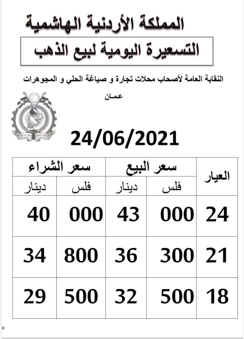 وبلغ سعر بيع الغرام من الذهب عياري 24 و18 لغايات الشراء من محلات الصاغة عند 43.00 و32.50 دينارا على التوالي.